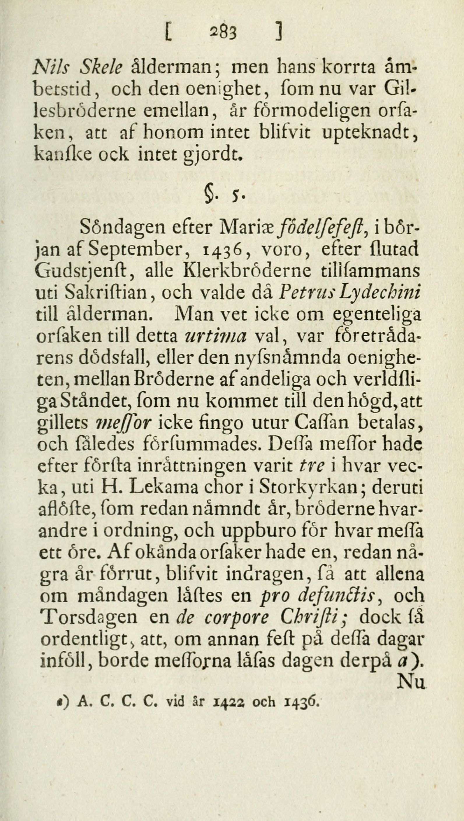 Söndagen efter Mariæ födelsefest, i början af September, 1436, voro, efter slutad Gudstjenst, alle Klerkbröderne tillsammans uti Sakristian, och valde då Petrus Lydechini till ålderman. Man vet icke om egenteliga orsaken till detta urtima val, var företrädarens dödsfall, eller den nyssnämnda oenigheten, mellan Bröderne af andeliga och verldsliga Ståndet, som nu kommet till den högd, att gillets messor icke fingo utur Cassan betalas, och således försummades. Dessa messor hade efter första inrättningen varit tre i hvar vecka, uti H. Lekarna chor i Storkyrkan; deruti aflöste, som redan nämndt är, bröderne hvarandre i ordning, och uppburo för hvar messa ett öre. Af okända orsaker hade en, redan några år förrut, blifvit indragen, så att allena om måndagen lästes en pro defunctis, och Torsdagen en de corpore Christi; dock så ordentligt, att, om annan fest på dessa dagar inföll, borde messorna läsas dagen derpå [1].