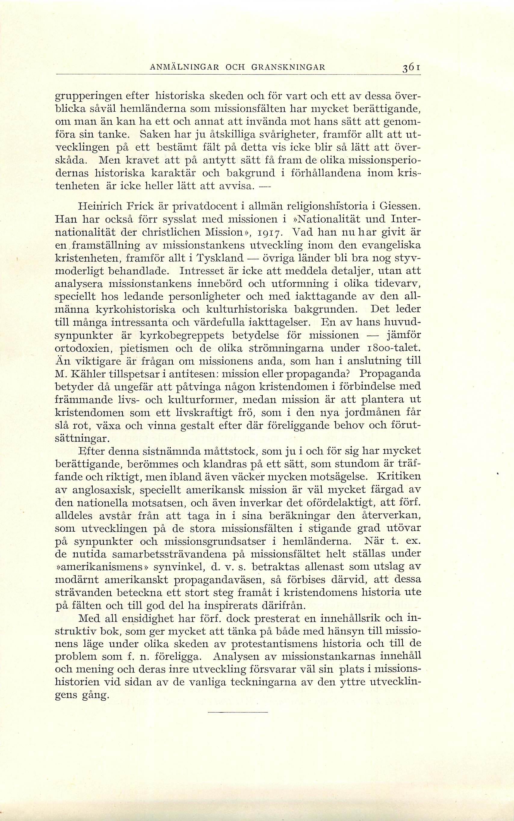 Full resolution (JPEG) - On this page / på denna sida - II. Meddelanden och aktstycken - III. Anmälningar och granskningar - K. B. Westman, Två missionshistoriska översiktsarbeten: Julius Richter, Evangelische Missionskunde, Leipzig 1920, och Heinrich Frick, Die evangelische Mission: Ursprung, Geschichte, Ziel, Bonn und Leipzig 1922