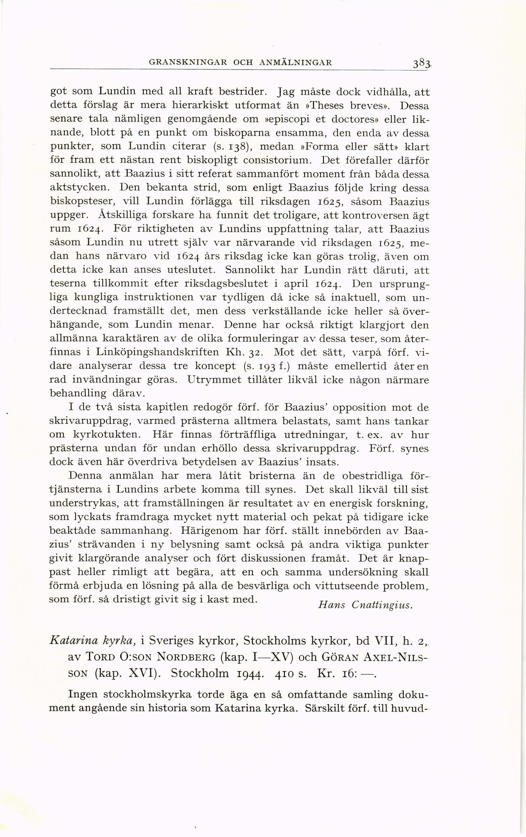 Full resolution (JPEG) - On this page / på denna sida - III. Granskningar och anmälningar - Hans Lundin, Joannes Baazius’ kyrkliga reformprogram (Docent Hans Cnattingius) - Tord O:son Nordberg och Göran Axel-Nilsson, Katarina kyrka (Märta Edquist)