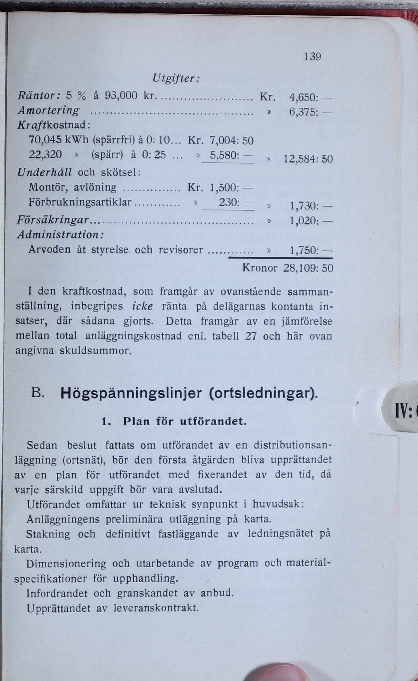 Full resolution (JPEG) - On this page / på denna sida - IV. Ortsnät - A. Förundersökning - 5. Uppskattning av anläggnings- och årskostnad - b) Årskostnad - B. Högspänningslinjer (ortsledningar) - 1. Plan för utförandet