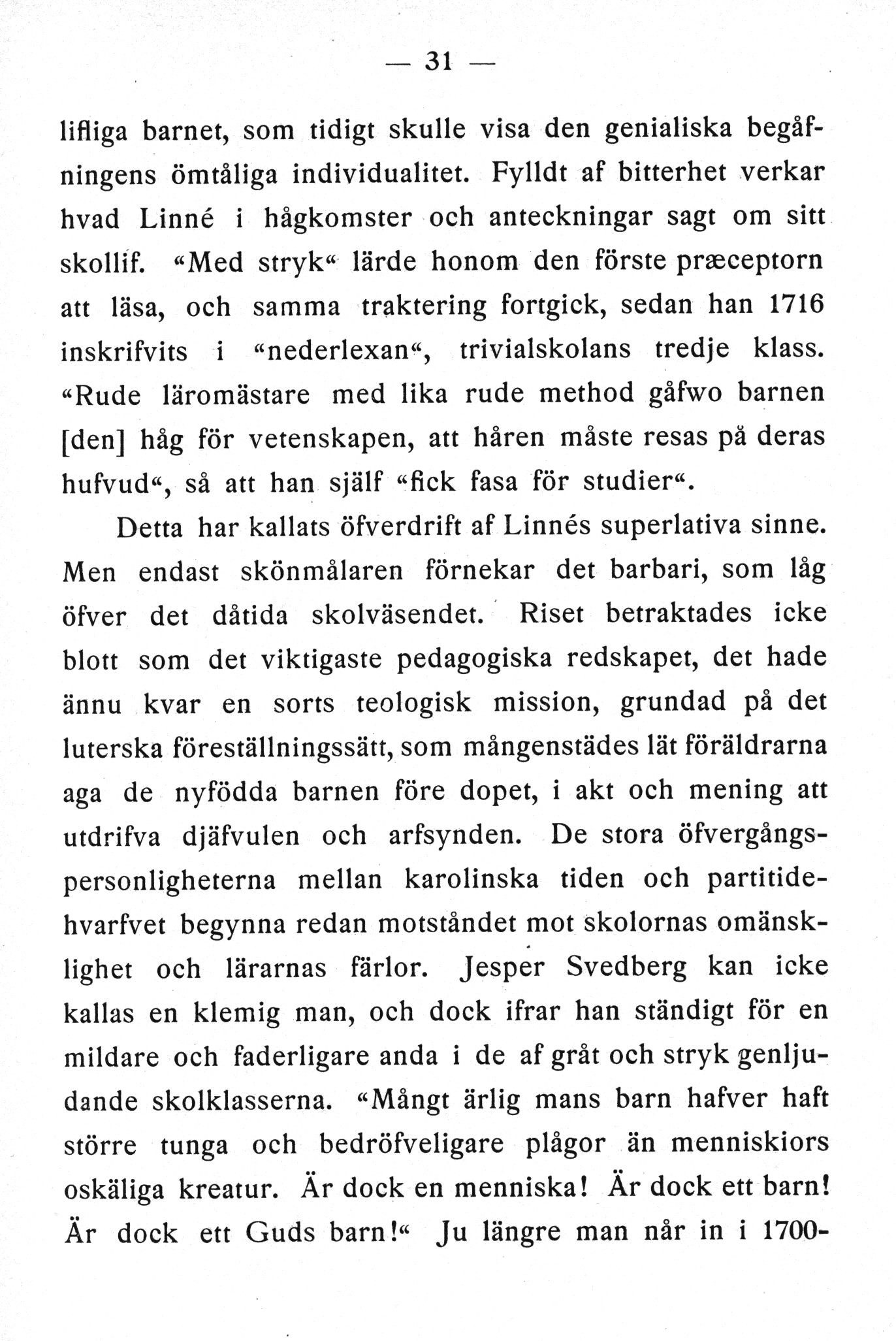 lifliga barnet, som tidigt skulle visa den genialiska begåfningens ömtåliga individualitet. Fylldt af bitterhet verkar hvad Linné i hågkomster och anteckningar sagt om sitt skollif. "Med stryk" lärde honom den förste præceptorn att läsa, och samma traktering fortgick, sedan han 1716 inskrifvits i "nederlexan", trivialskolans tredje klass. "Rude läromästare med lika rude method gåfwo barnen [den] håg för vetenskapen, att håren måste resas på deras hufvud", så att han själf "fick fasa för studier".