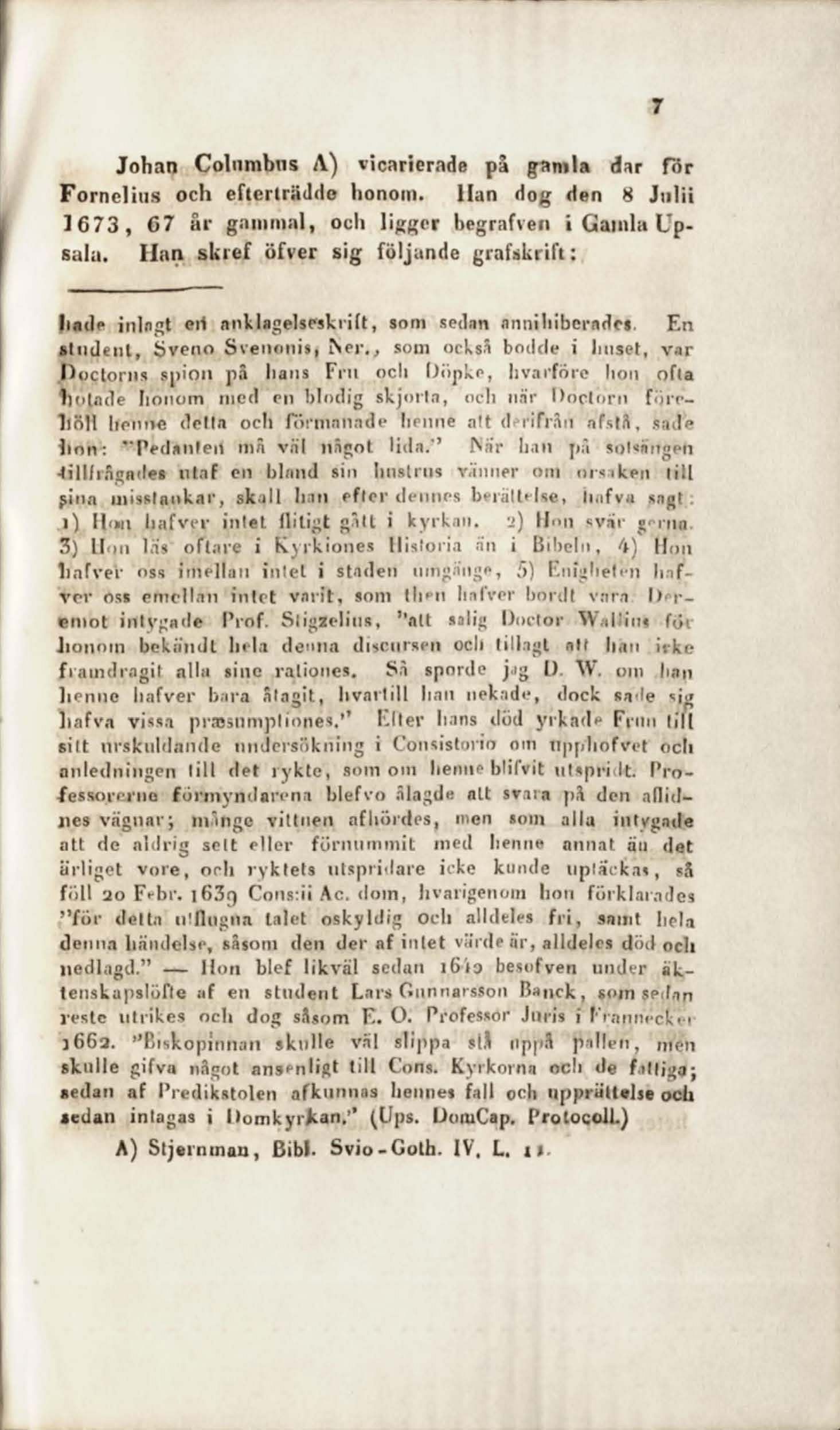 1673, 67 år gammal, och ligger begrafven i Gamla Upsala.