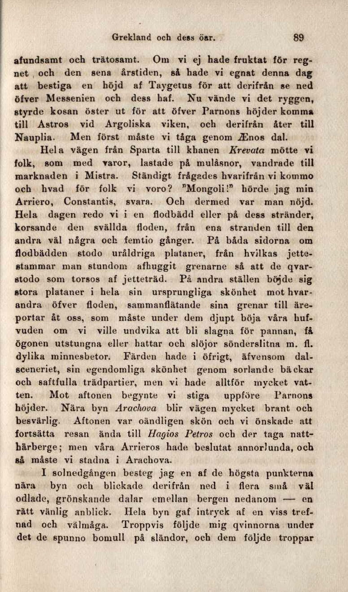 Full resolution (JPEG) - On this page / på denna sida - 32. Morgonvandring bland Spartas ruiner. Utsigt af Eurotas’ dal från Spartas Akropolis. Eviga minnen. Det spartanska lifsidealet. Leonidas’ graf. Mistra. Den stora marknaden. Ridt till Platanista och Parori. Lakedaimon förr och nu. Spartas qvinnor. Afresa öfver Hagios Petros till Astros och till Nauplia. Från Nauplia till Mykenä och Korinth. Från Korinth till Athen
