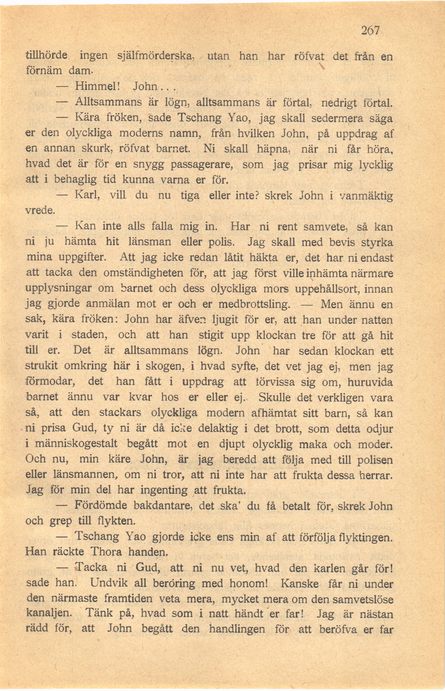 — Karl, vill du nu tiga eller inte? skrek John i vanmäktig