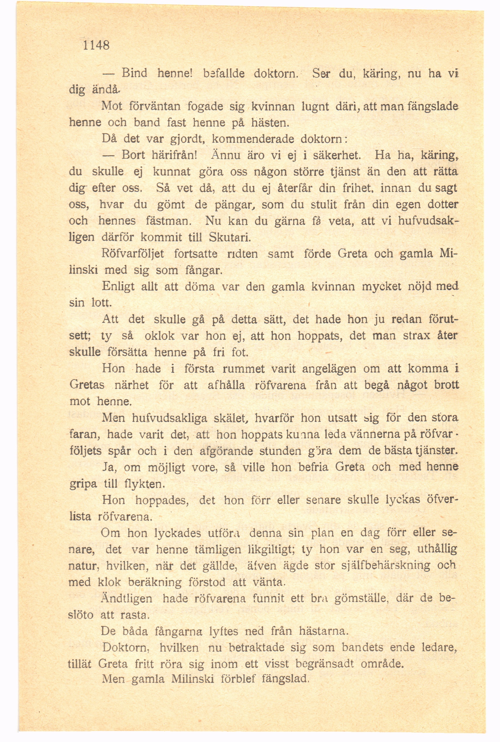 — Bind henne! bafallde doktorn. Ser du, käring, nu ha vi