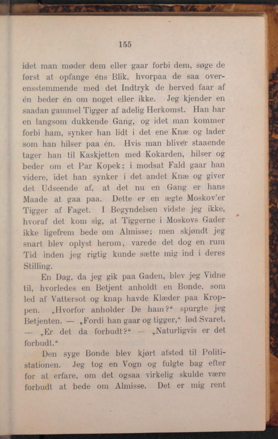 Betjenten. — „Fordi han gaar og tigger,“ lød Svaret.