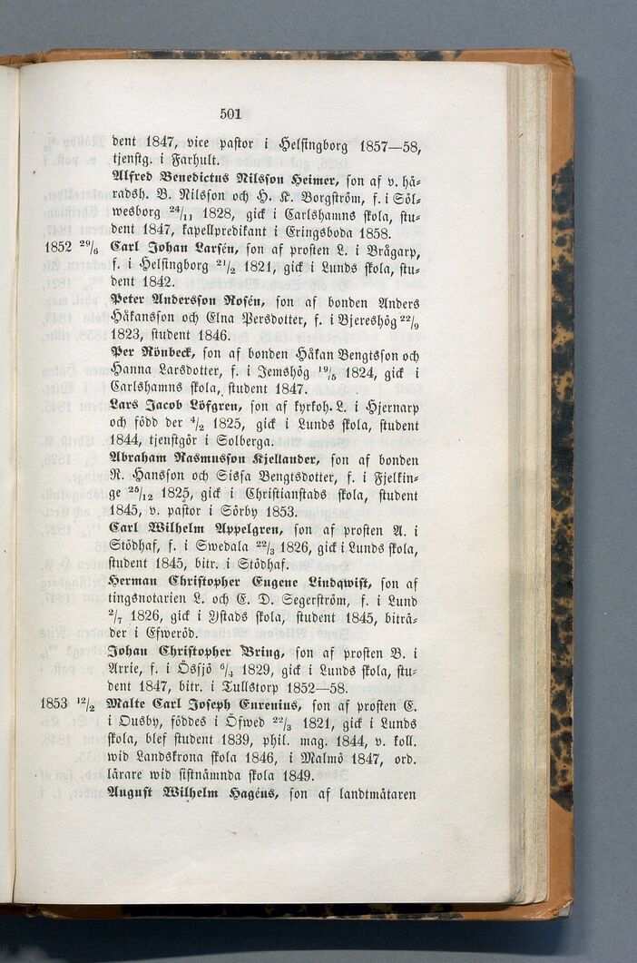 1852 29/6 Carl Johan Larsén, son af prosten L. i Brågarp,