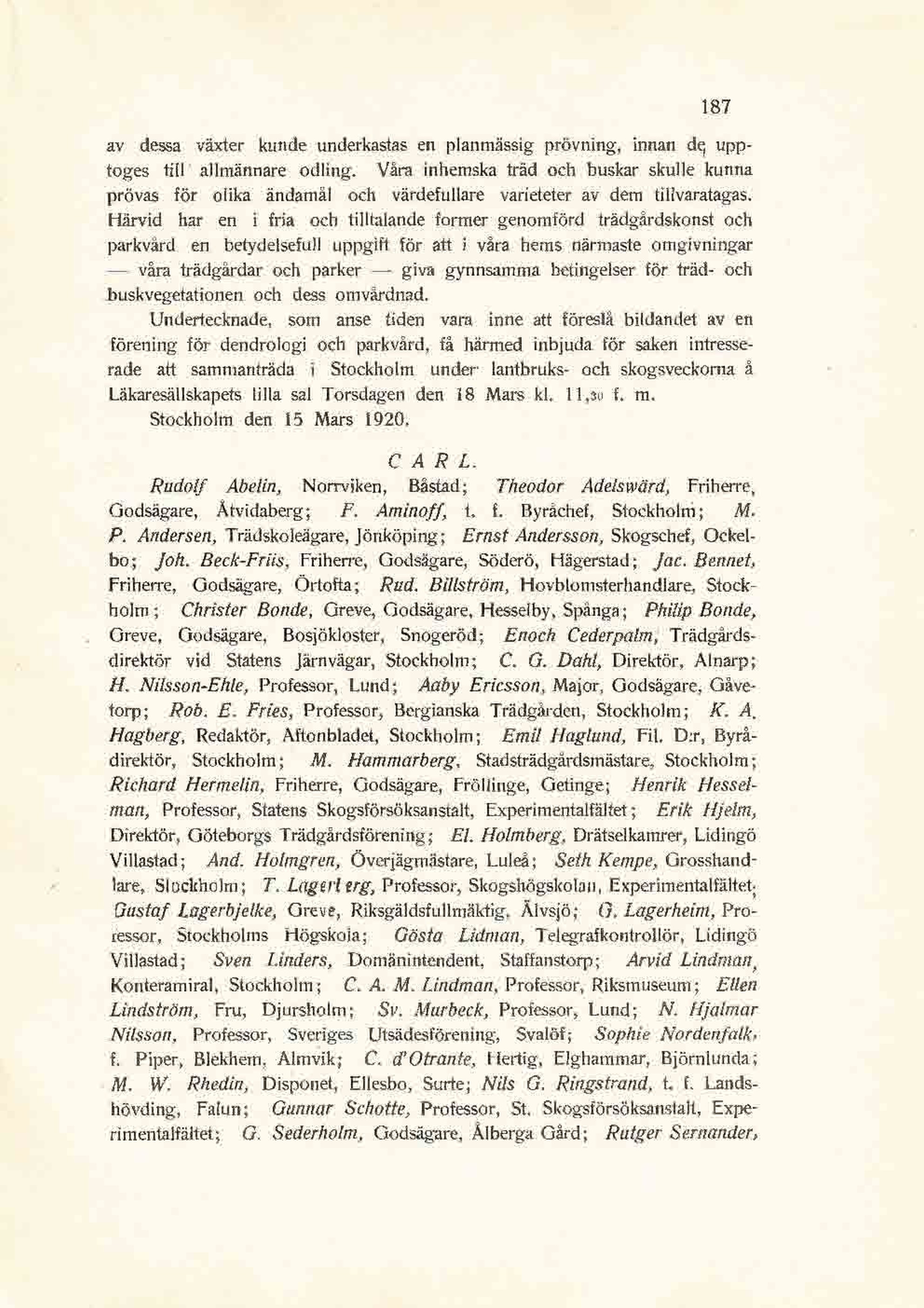 Lindström, Fru, Djursholm; Sv. Murbeck, Professor, Lund; N. Hjälmar