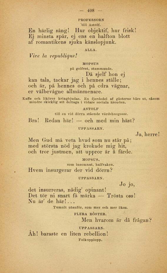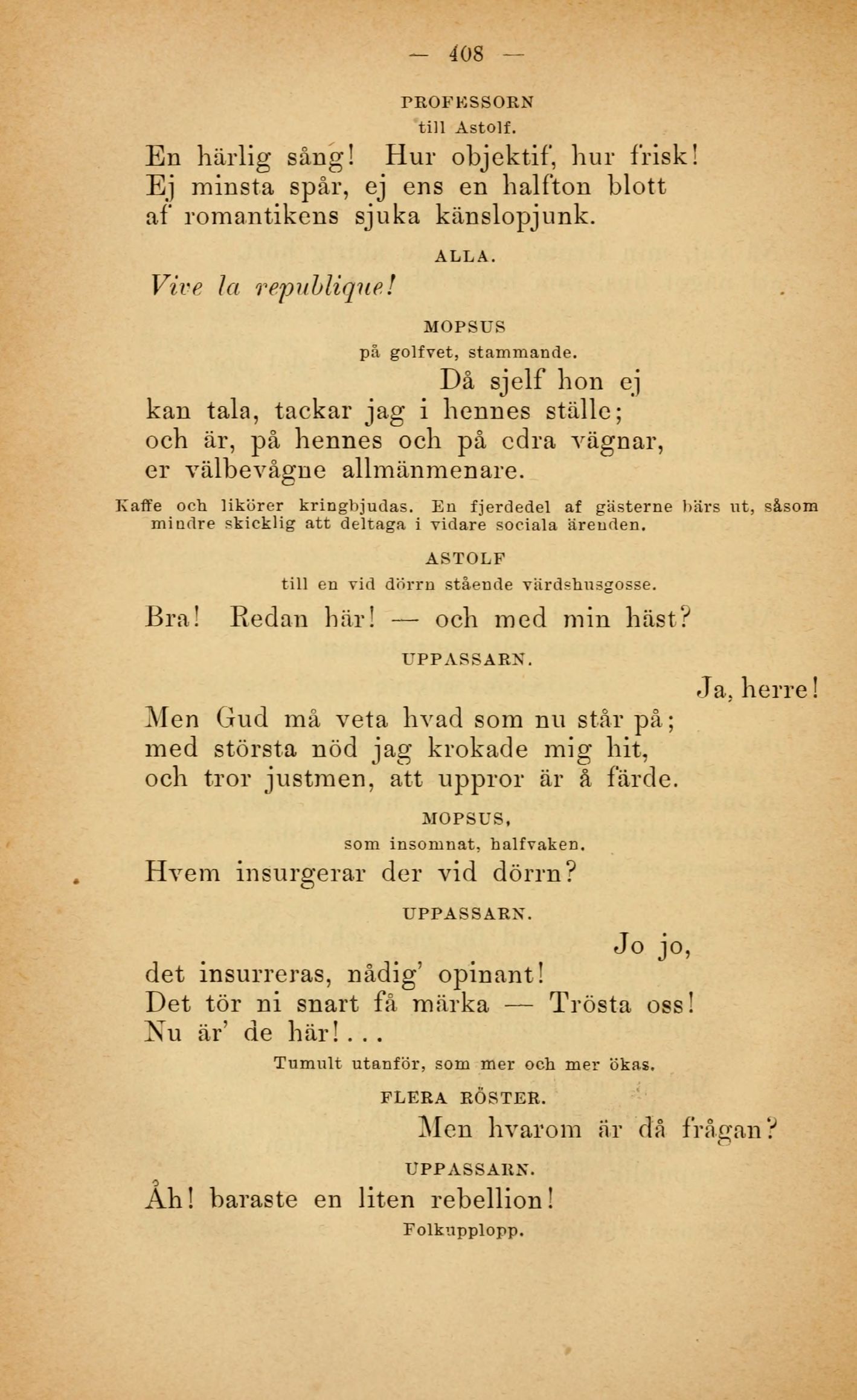 Kaffe och likörer kringbjudas. En fjerdedel af gästerne bärs ut, såsom
