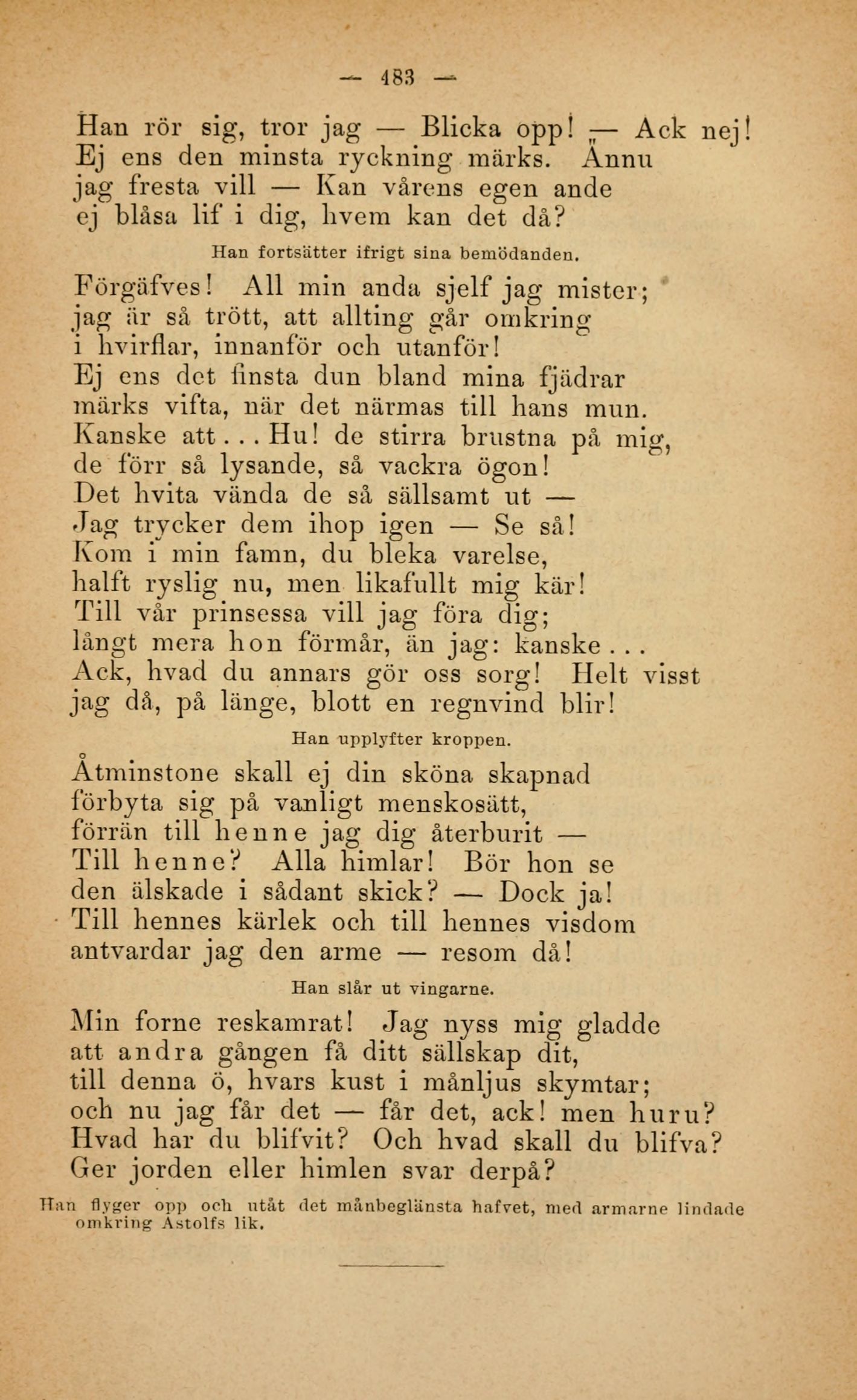 Han flyger opp ocli utåt det månbeglansta hafvet, med arm nr ne lindnde