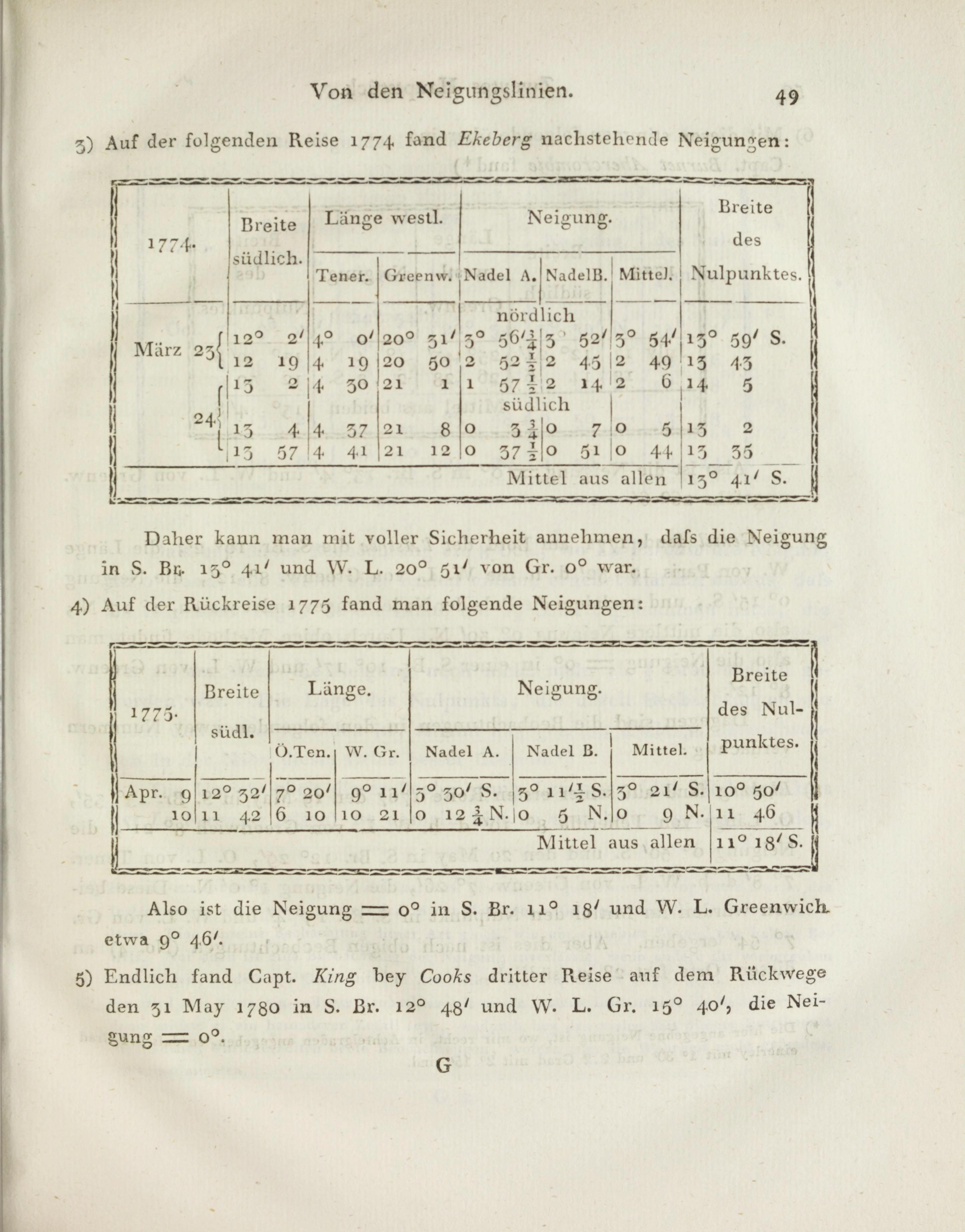 Vuf der Ruckreise 1775 fand man folgende Neigungen: