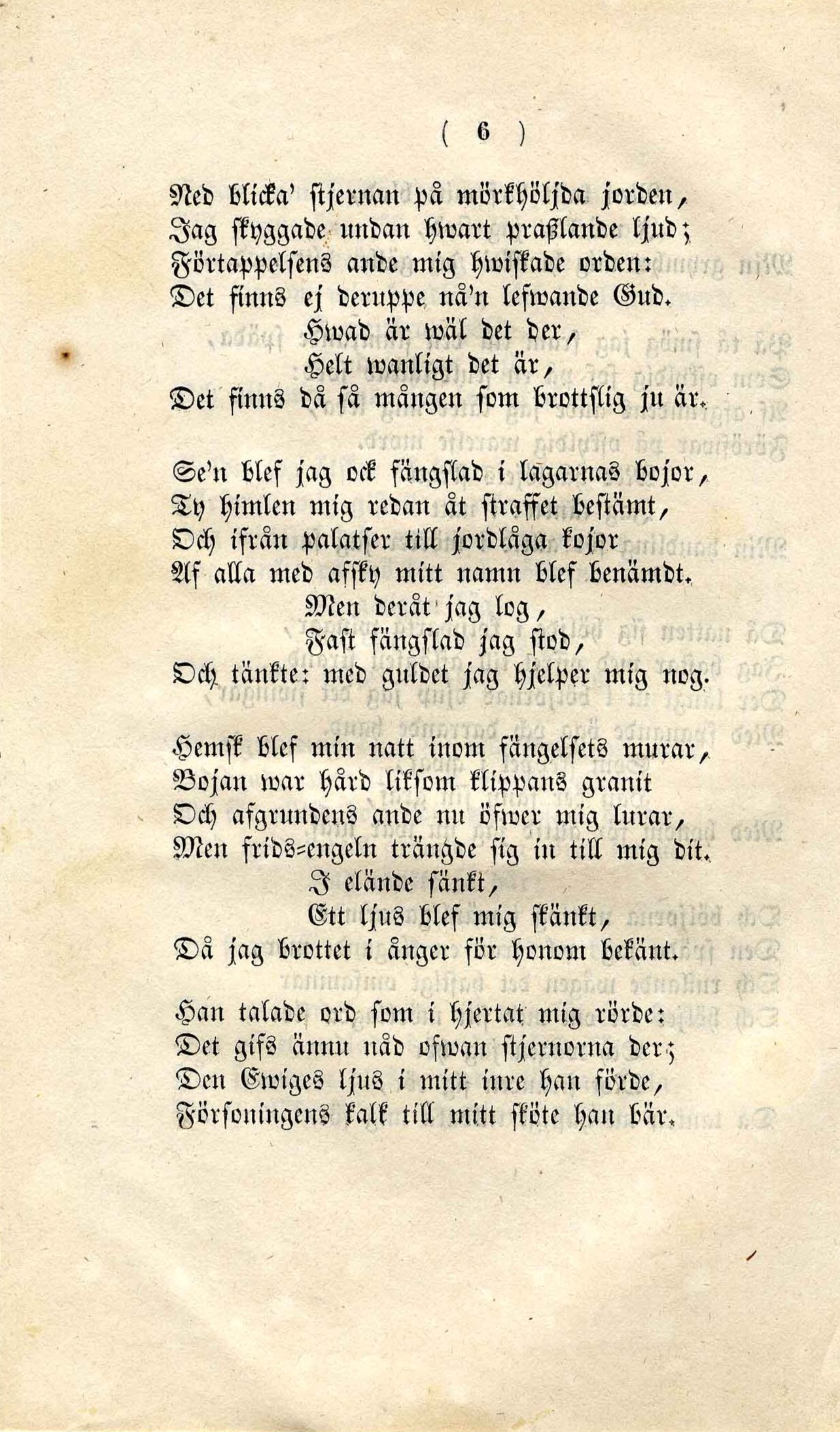 Ned blicka’ stjernan på mörkhöljda jorden, Se’n blef jag ock fängslad i lagarnas bojor, Hemskt blef min natt inom fängelsets murar, Han talade ord som i hjertat mig rörde: |