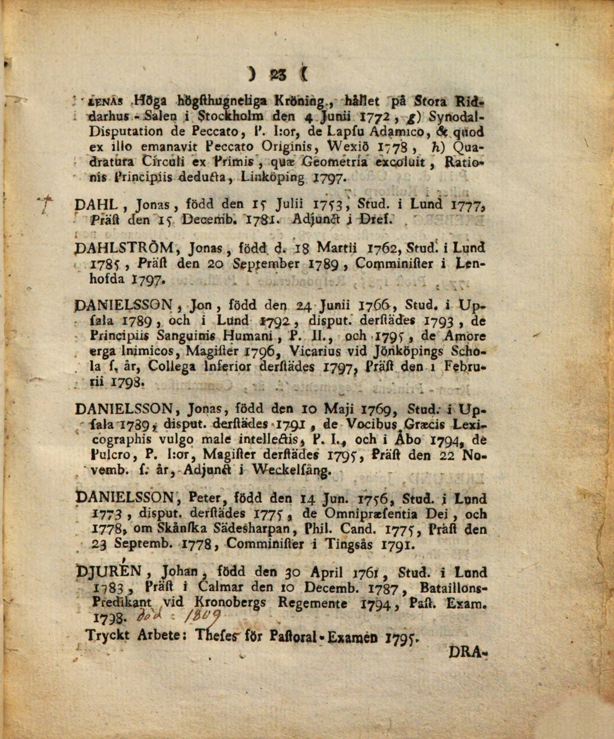 DAHL, Jonas, född den 15 Julii 1753, Stud. i Lund 1777,