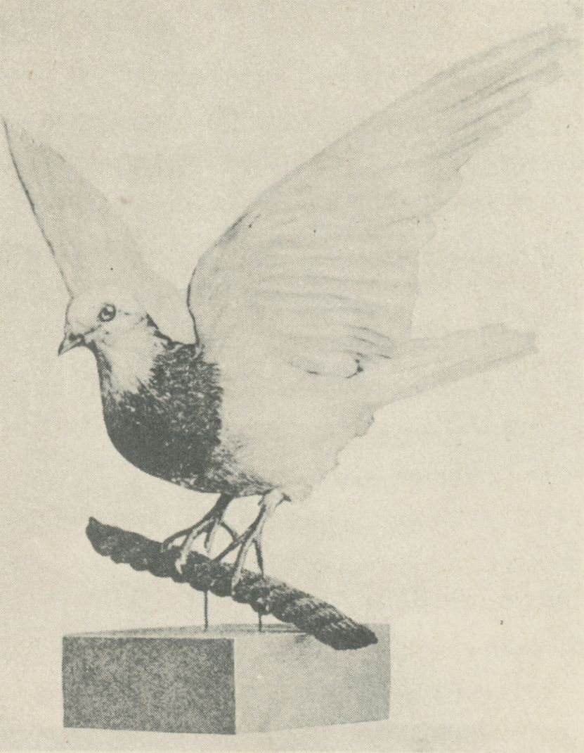 Brevduvan, som lämnade "Örnen" den 13 juli kl. 13,08, och sköts två dagar senare på norska fångstfartyget "Alken" sedan den flugit minst 170 km. Nu i Naturhistoriska riksmuseet i Stockholm. |