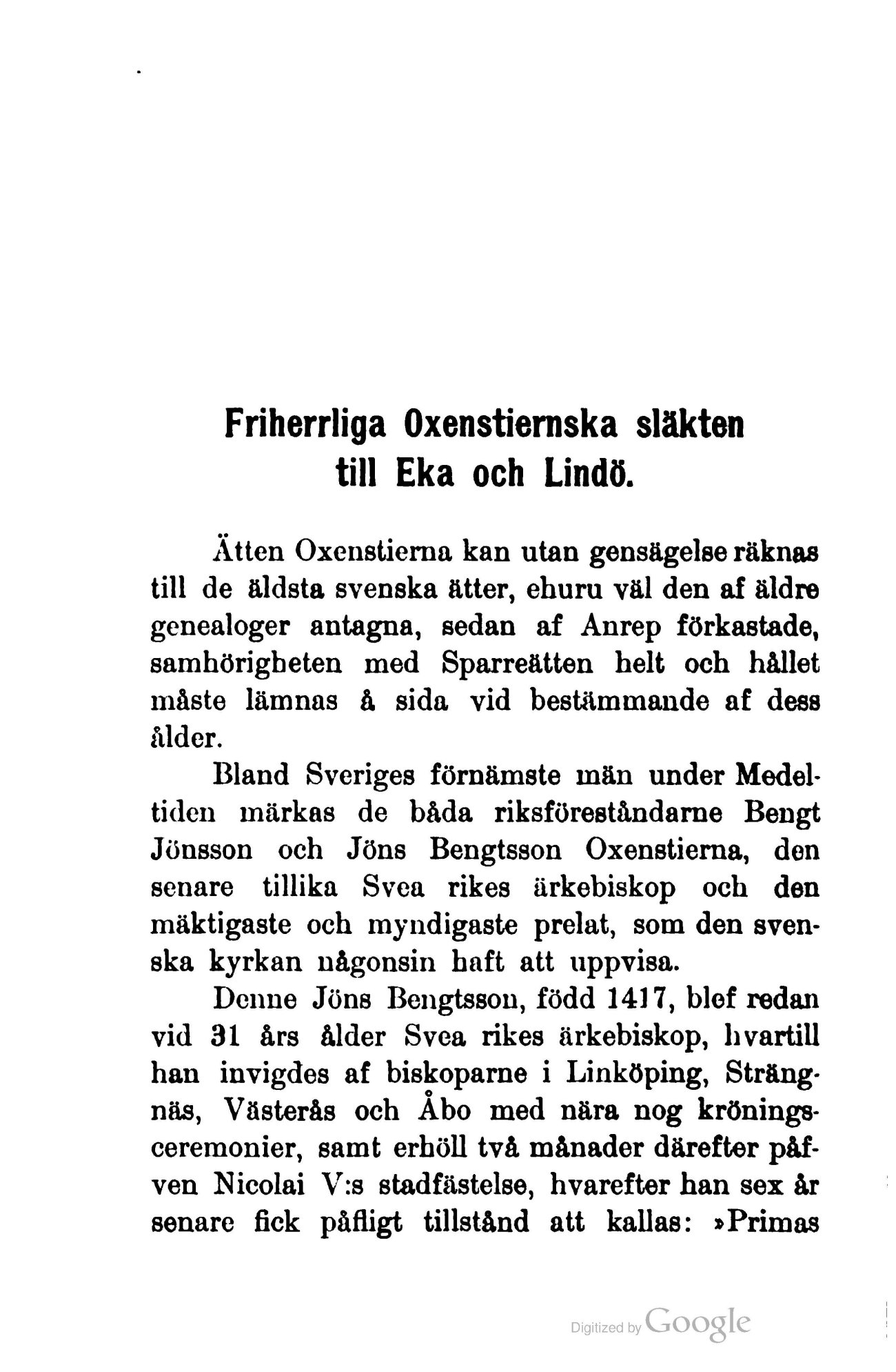 - Friherrliga Oxenstiernska släkten till Eka och Lindö