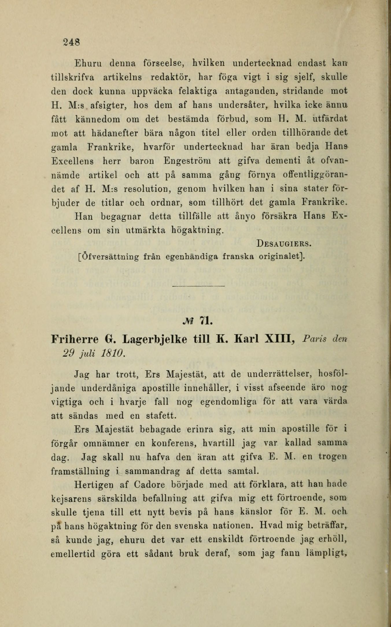 [Öfversättning från egenhändiga franska originalet].