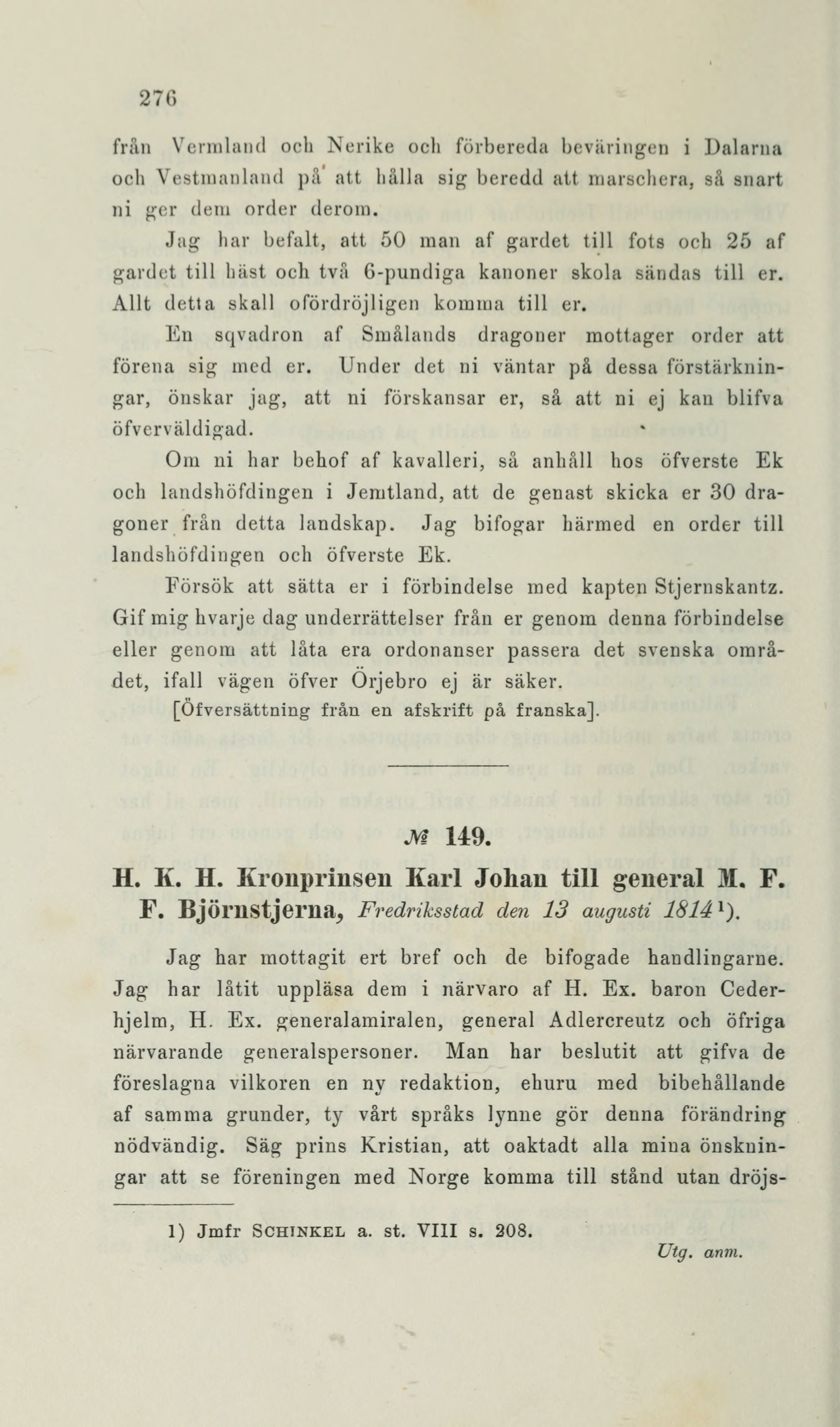F. Björnstjerna, Fredriksstad den 13 augusti 1814x).