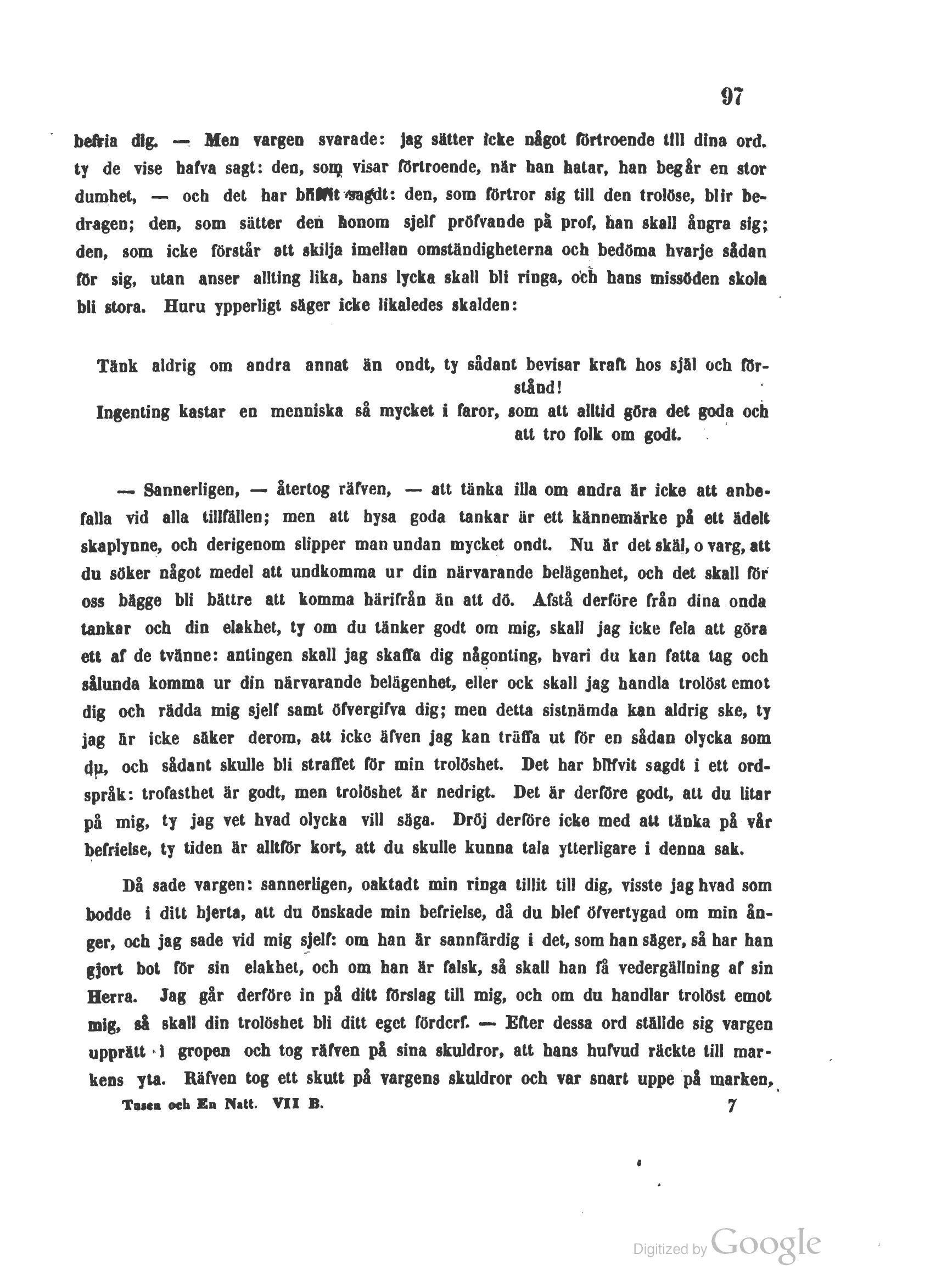 Då sade vargen: sannerligen, oaktadt min ringa tillit till dig, visste jag hvad som
