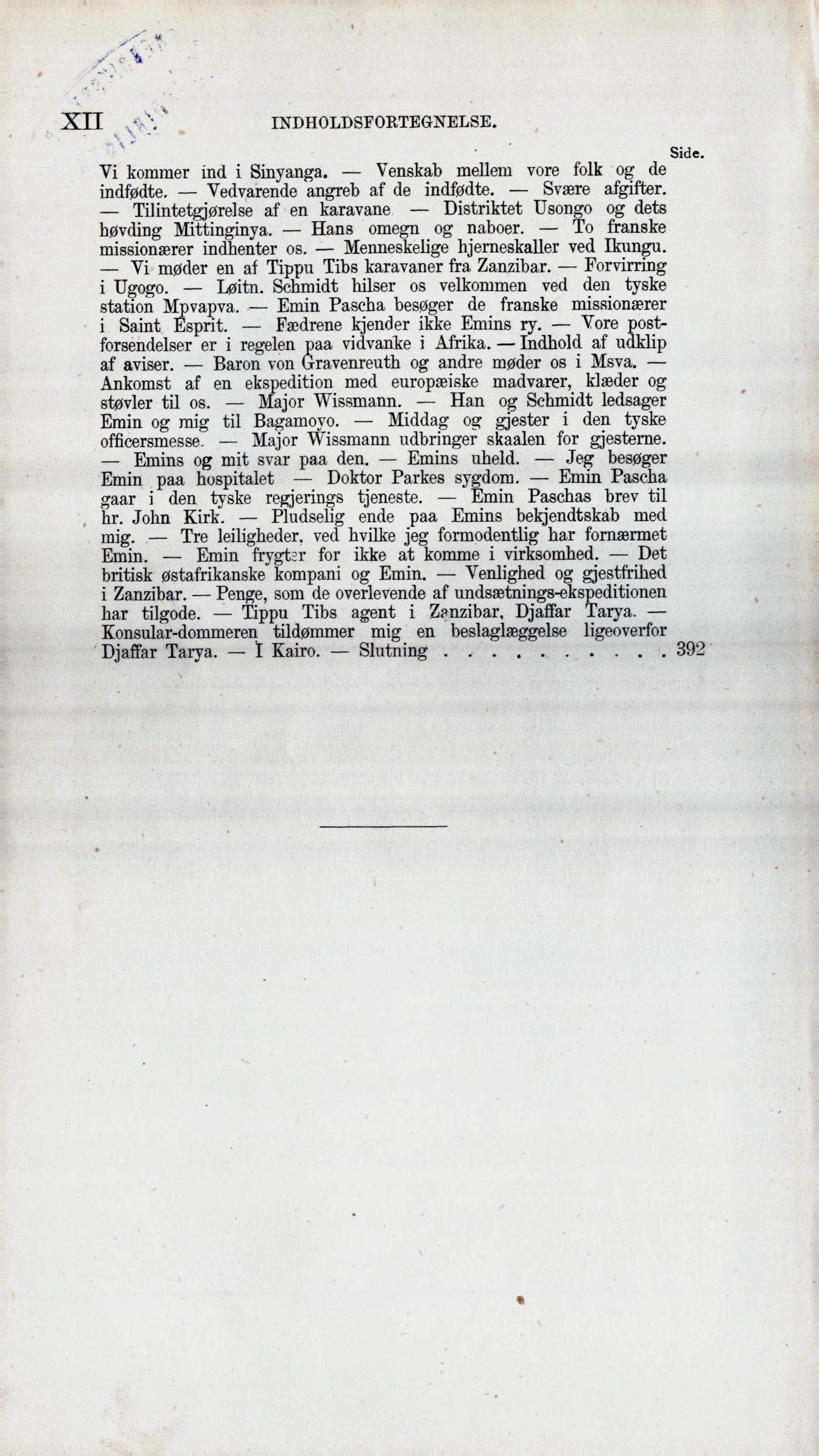 indfødte. — Vedvarende angreb af de indfødte. — Svære afgifter. — Tilintetgjørelse af en karavane — Distriktet Usongo og dets høvding Mittinginya. — Hans omegn og naboer. — To franske missionærer indhenter os. — Menneskelige hjerneskaller ved Ikungu. — Vi møder en af Tippu Tibs karavaner fra Zanzibar. — Forvirring i Ugogo. — Løitn. Schmidt hilser os velkommen ved den tyske station Mpvapva. — Emin Pascha besøger de franske missionærer i Saint Esprit. — Fædrene kjender ikke Emins ry. — Vore postforsendelser er i regelen paa vidvanke i Afrika. — Indhold af udklip af aviser. — Baron von Gravenreuth og andre møder os i Msva. — Ankomst af en ekspedition med europæiske madvarer, klæder og støvler til os. — Major Wissmann. — Han og Schmidt ledsager Emin og mig til Bagamoyo. — Middag og gjester i den tyske officersmesse. — Major Wissmann udbringer skaalen for gjesterne. — Emins og mit svar paa den. — Emins uheld. — Jeg besøger Emin paa hospitalet — Doktor Parkes sygdom. — Emin Pascha gaar i den tyske regjerings tjeneste. — Emin Paschas brev til hr. John Kirk. — Pludselig ende paa Emins bekjendtskab med mig. — Tre leiligheder, ved hvilke jeg formodentlig har fornærmet Emin. — Emin frygter for ikke at komme i virksomhed. — Det britisk østafrikanske kompani og Emin. — Venlighed og gjestfrihed i Zanzibar. — Penge, som de overlevende af undsætnings-ekspeditionen har tilgode. — Tippu Tibs agent i Z?nzibar, Djaffar Tarya. — Konsular-dommeren tildømmer mig en beslaglæggelse ligeoverfor Djaffar Tarya. — I Kairo. — Slutning | 392 |