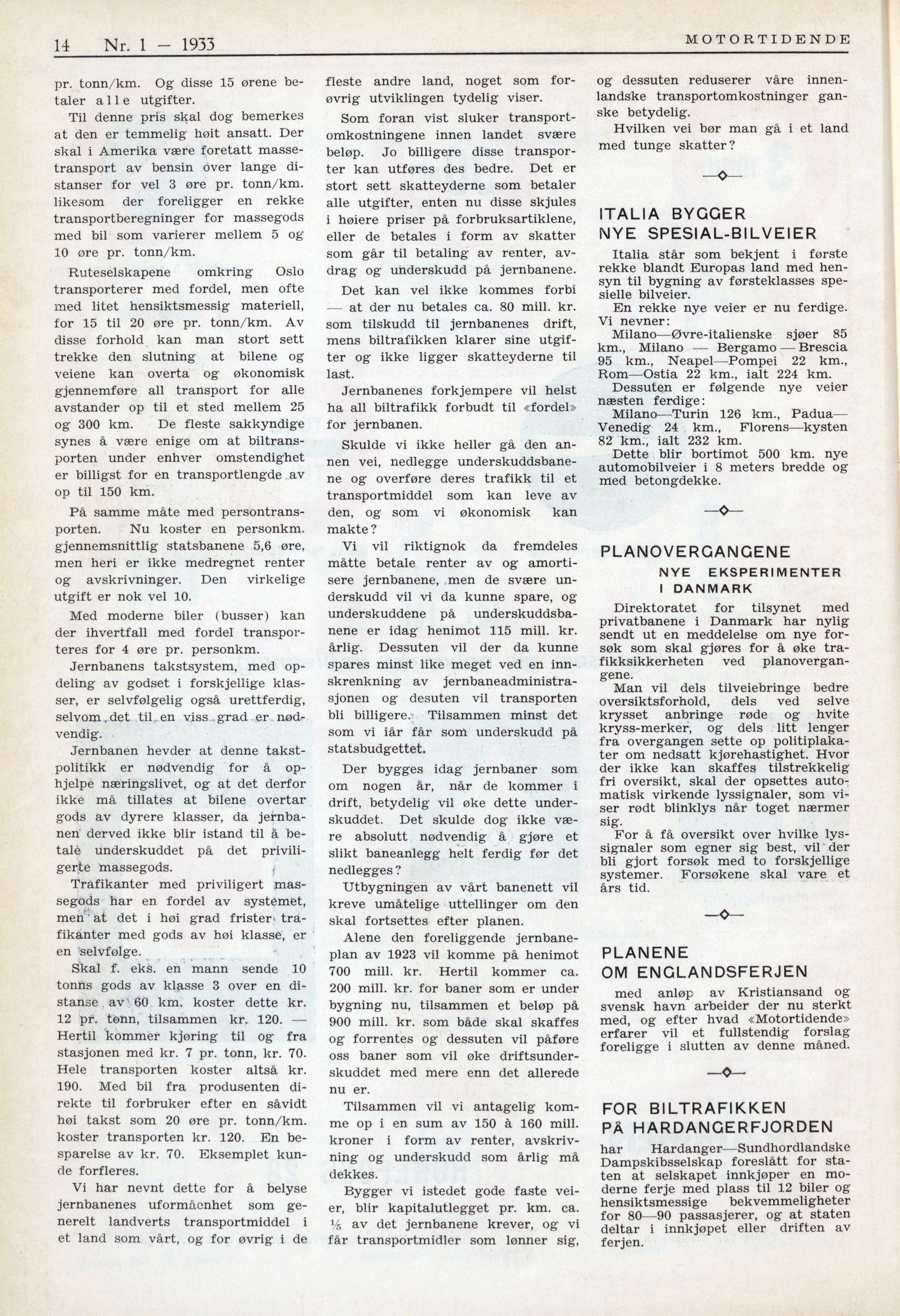 Full resolution (JPEG) - On this page / på denna sida - Veiene våre. Hvad jernbanen koster det norske folk - Italia bygger nye spesial-bilveier - Planovergangene. Nye eksperimenter i Danmark - Planene om Englandsferjen - For biltrafikken på Hardangerfjorden