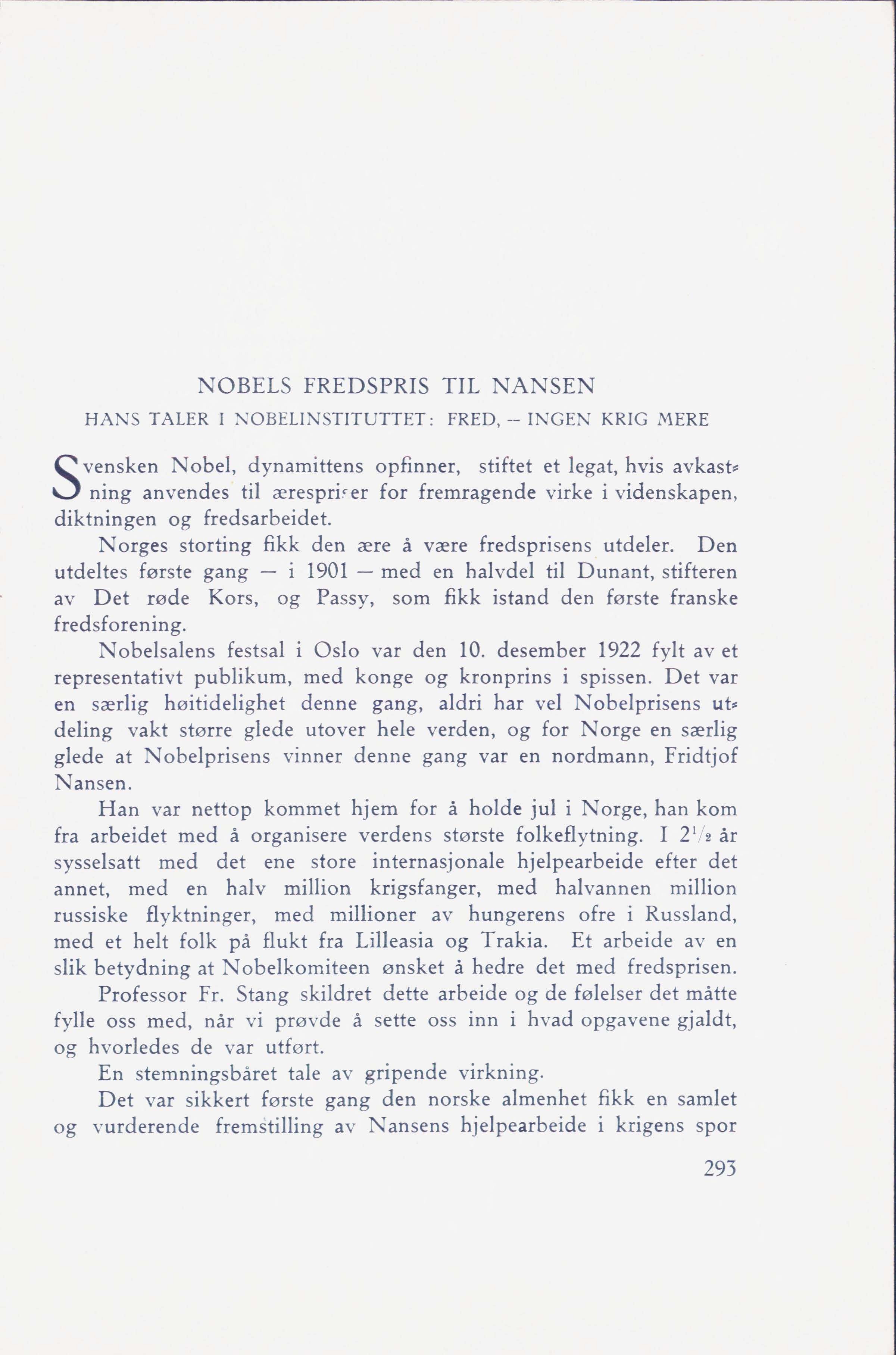 NOBELS FREDSPRIS TIL NANSEN