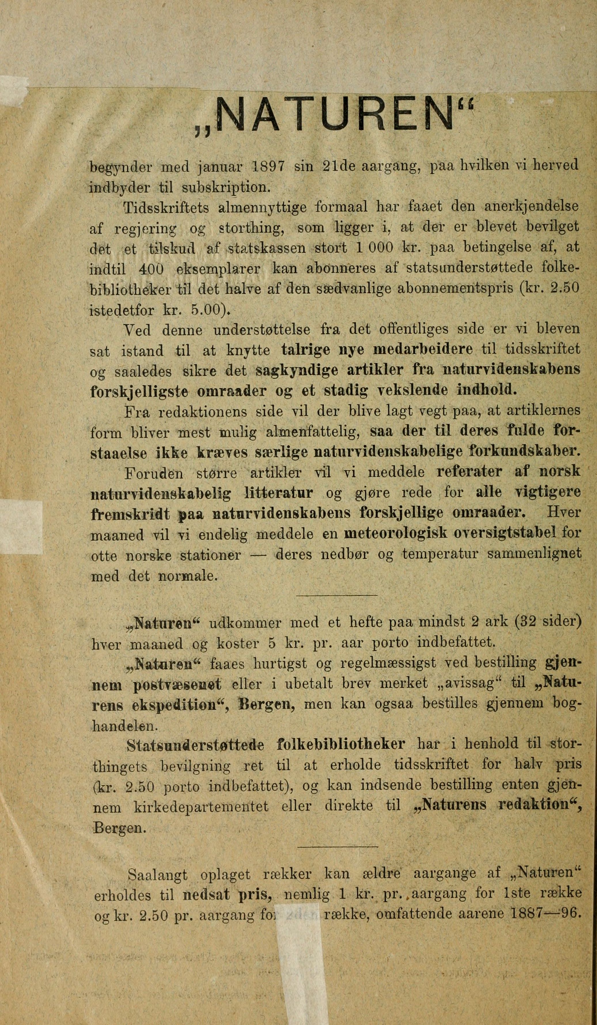 „Naturen" udkommer med et hefte paa mindst 2 ark (32 sider)