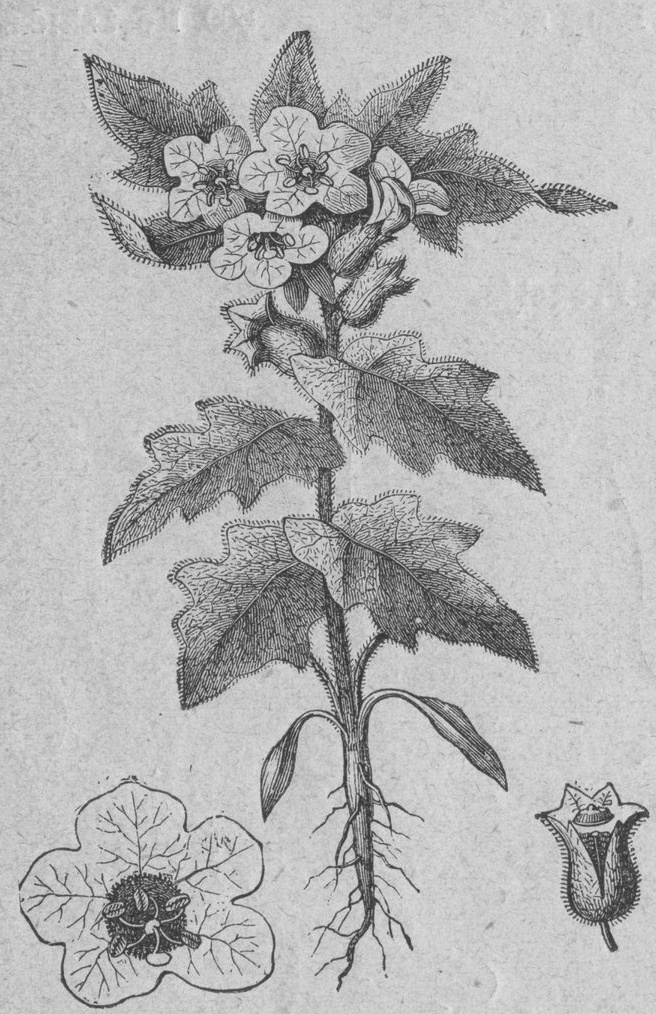 520. Bolmört (Hyoscyavu niger). Pentándria, Monogynia; Solanáceæ a Blomkrona, b Frukt. |