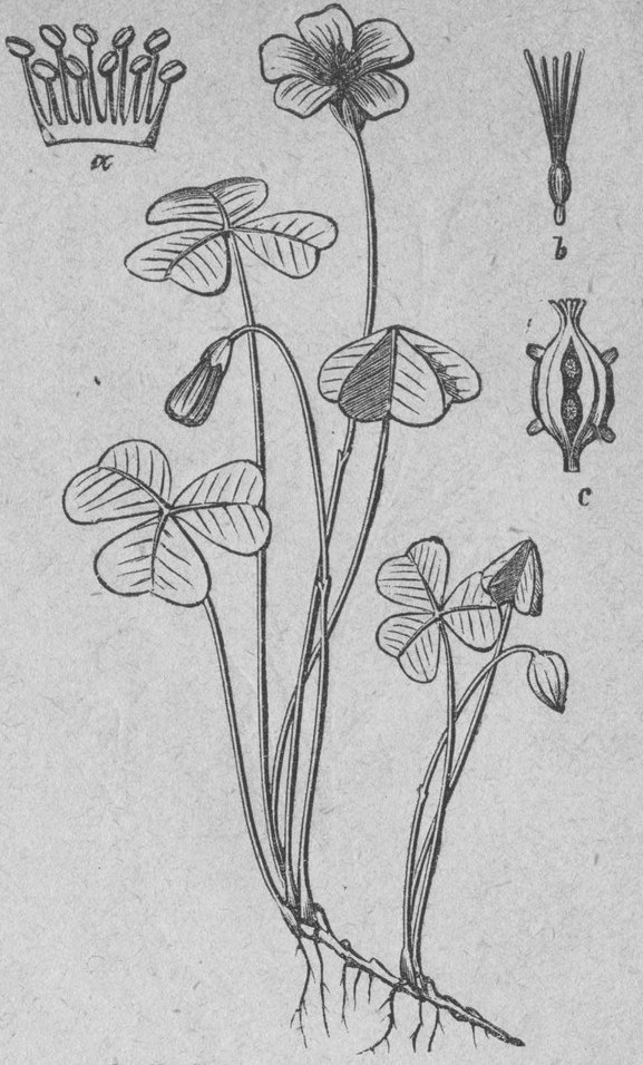 537. Vanlig harsyra (Oxalis acetosélla). Monadélphia, Decándria; Gruináles. a Ståndare. b Pistill. c Frukt. |