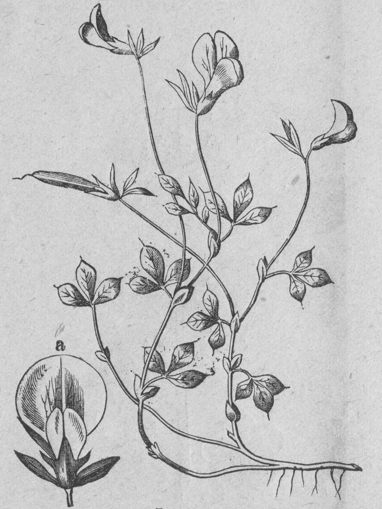 539. Kantbalja (Tetragonölobus siliquösus). Diadélphia, Decándria; Papilionáceæ. a Blomma (förstorad). |