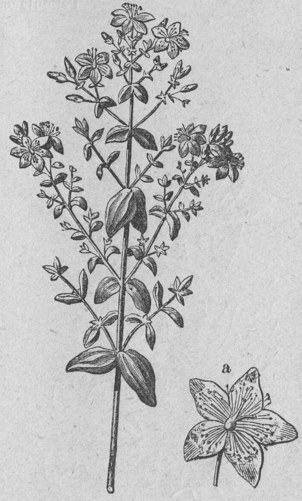 540. Äkta johannisört (Hypericum perfordtum). Polyadélphia, Polygynia; Hypericíneæ. a Blomma (förstorad). |