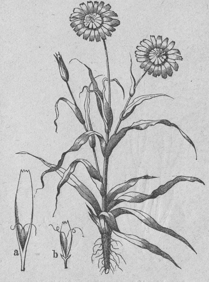541. Ängshafrerot (Tragopögon praténsis). Syngenésia, Monoclínia; Synanthéreæ. a Kantblomma (förstorad). b Diskblomma (förstorad). |
