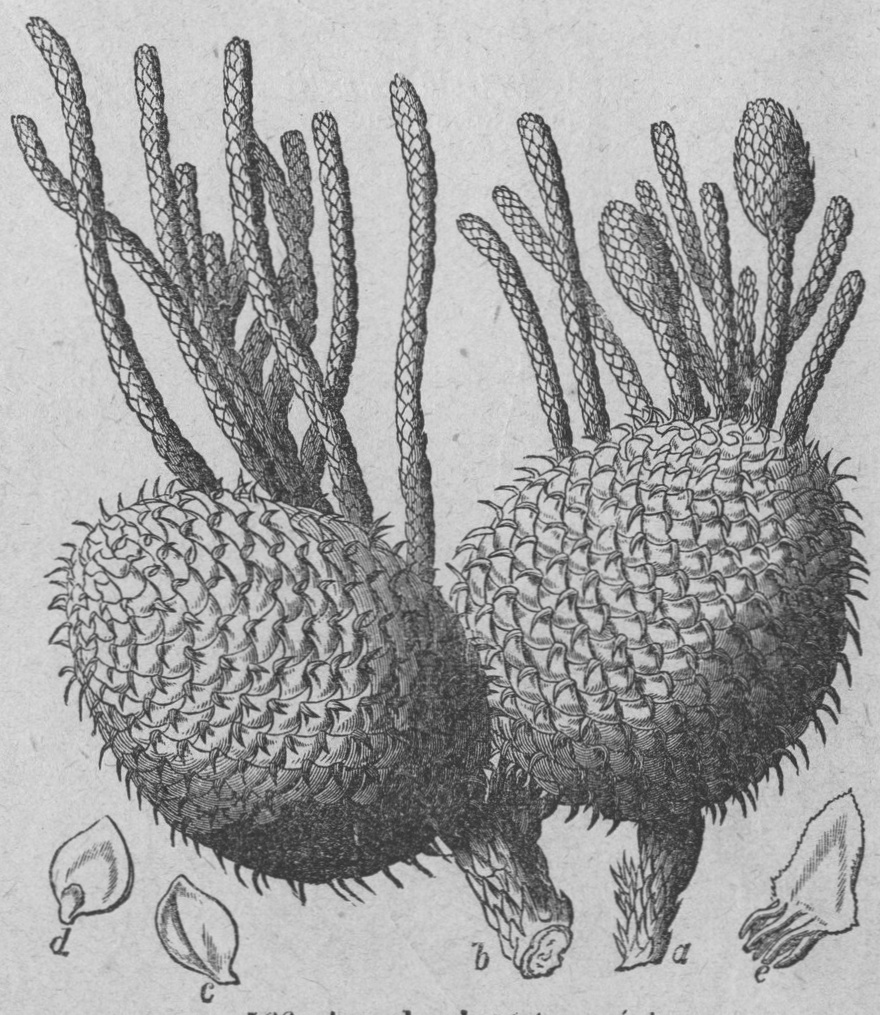 569. Trädartad ormbunke (Balantium arloréscens). Cryptogámia, Filices; Cyatheáceæ. a Sidoflik (i naturlig storlek) af ett blad. b Småflik af ett blad. |