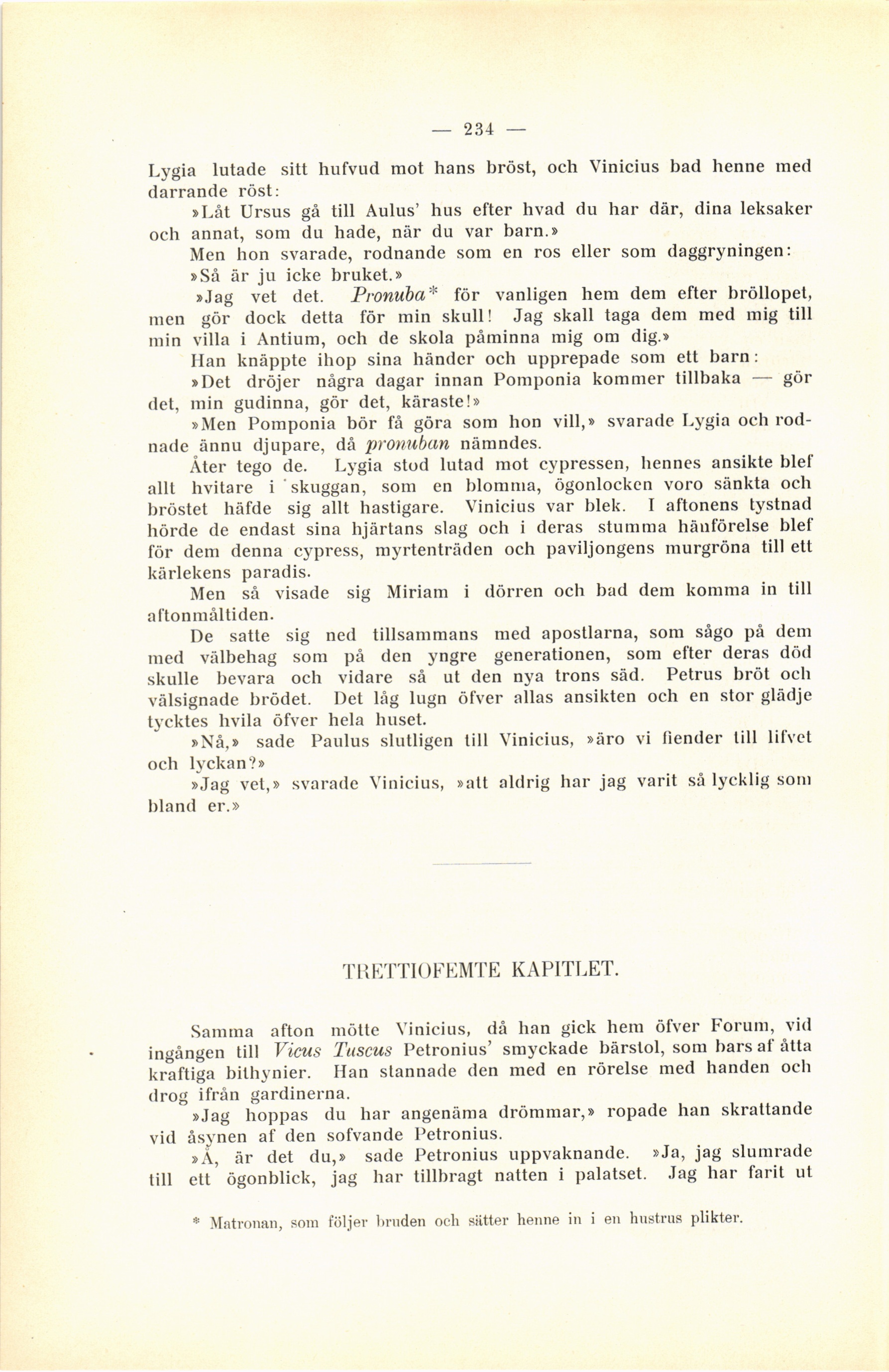 Lygia lutade sitt hufvud mot hans bröst, och Vinicius bad henne med