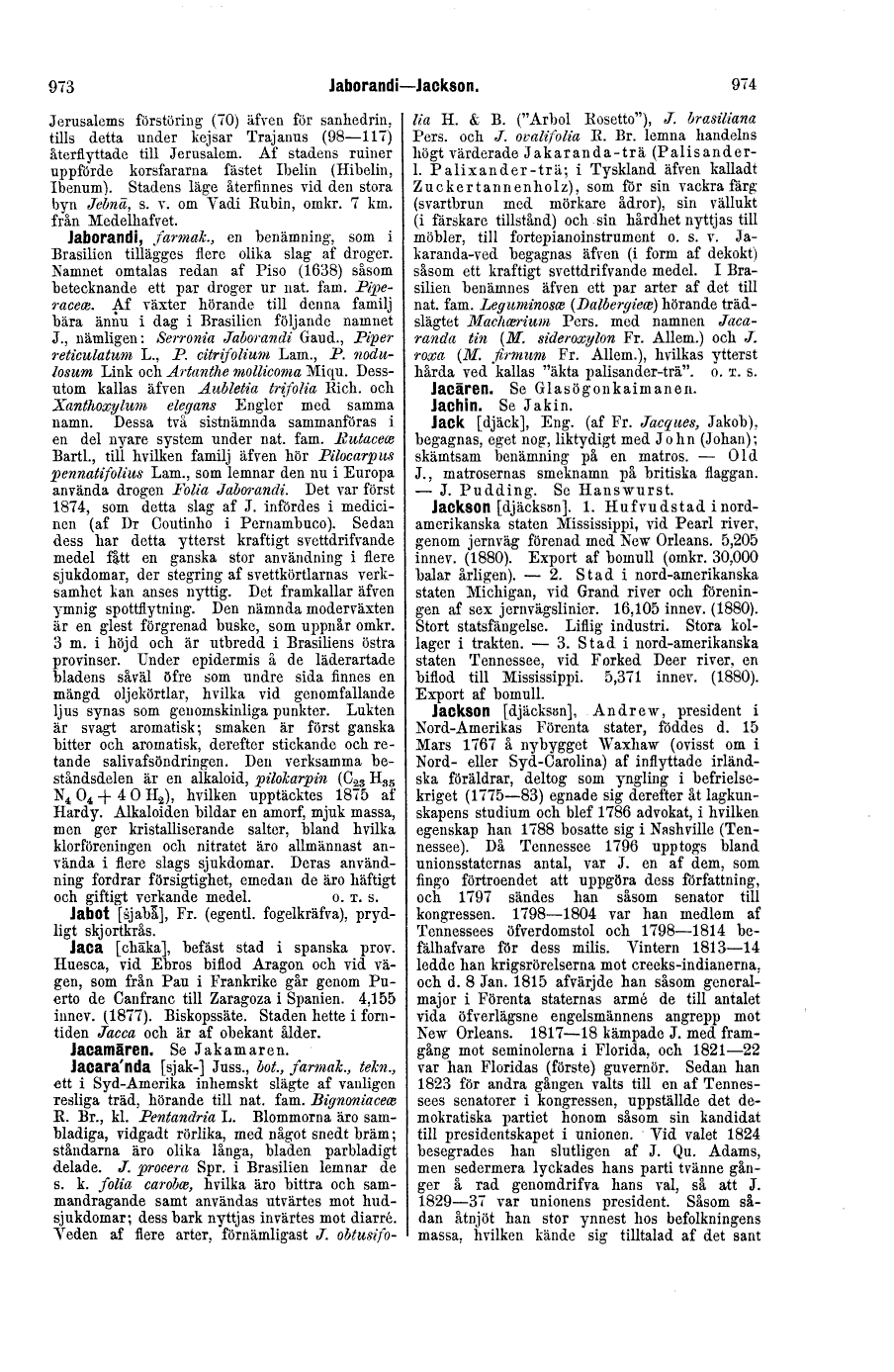 Full resolution (TIFF) - On this page / på denna sida - Jabne, filisteisk sjöstad mellan Joppe och Asdod - Jaborandi, farmak., en benämning, som i Brasilien tillägges flere olika slag af droger - Jabot, Fr., prydligt skjortkrås - Jaca, befäst stad i spanska prov. Huesca - Jacamaren. Se Jakamaren - Jacaranda Juss., bot., farmak., tekn., ett i Syd-Amerika inhemskt slägte af vanligen resliga träd - Jacaren. Se Glasögonkaimanen - Jachin. Se Jakin - Jack, Eng., begagnas, eget nog, liktydigt med John; skämtsam benämning på en matros - Jackson. 1. Hufvudstad i nord-amerikanska staten Mississippi - Jackson. 2. Stad i nord-amerikanska staten Michigan - Jackson. 3. Stad i nord-amerikanska staten Tennessee - Jackson, Andrew