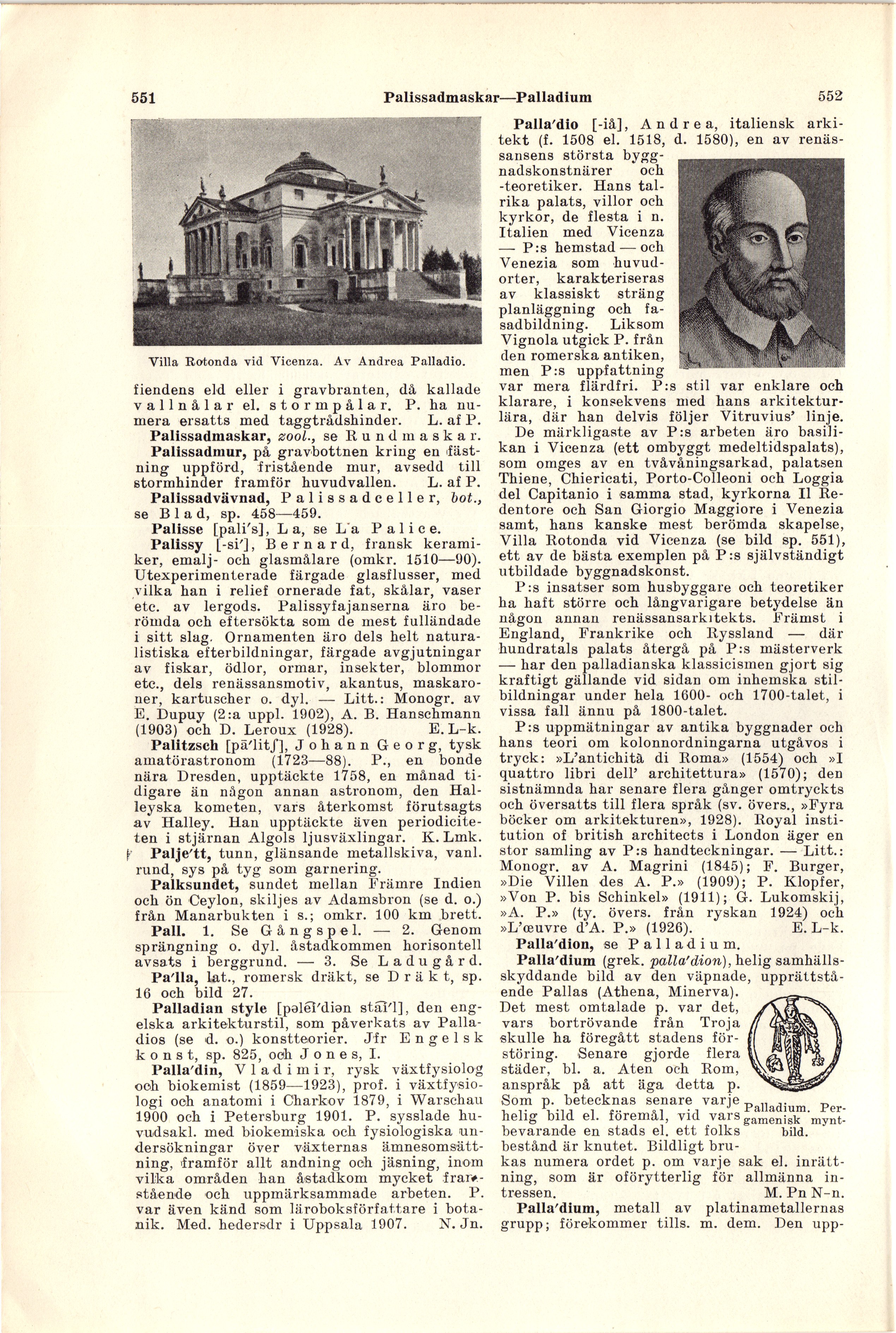 Full resolution (JPEG) - On this page / på denna sida - Palissad - Palissadmaskar - Palissadmur - Palissadvävnad, Palissadceller - Palisse - Palissy, Bernard - Palitzsch, Johann Georg - Paljett - Palksundet - Pall - Palla - Palladian style - Palladin, Vladimir - Palladio, Andrea - Palladion - Palladium (bild av Pallas) - Palladium (metall)