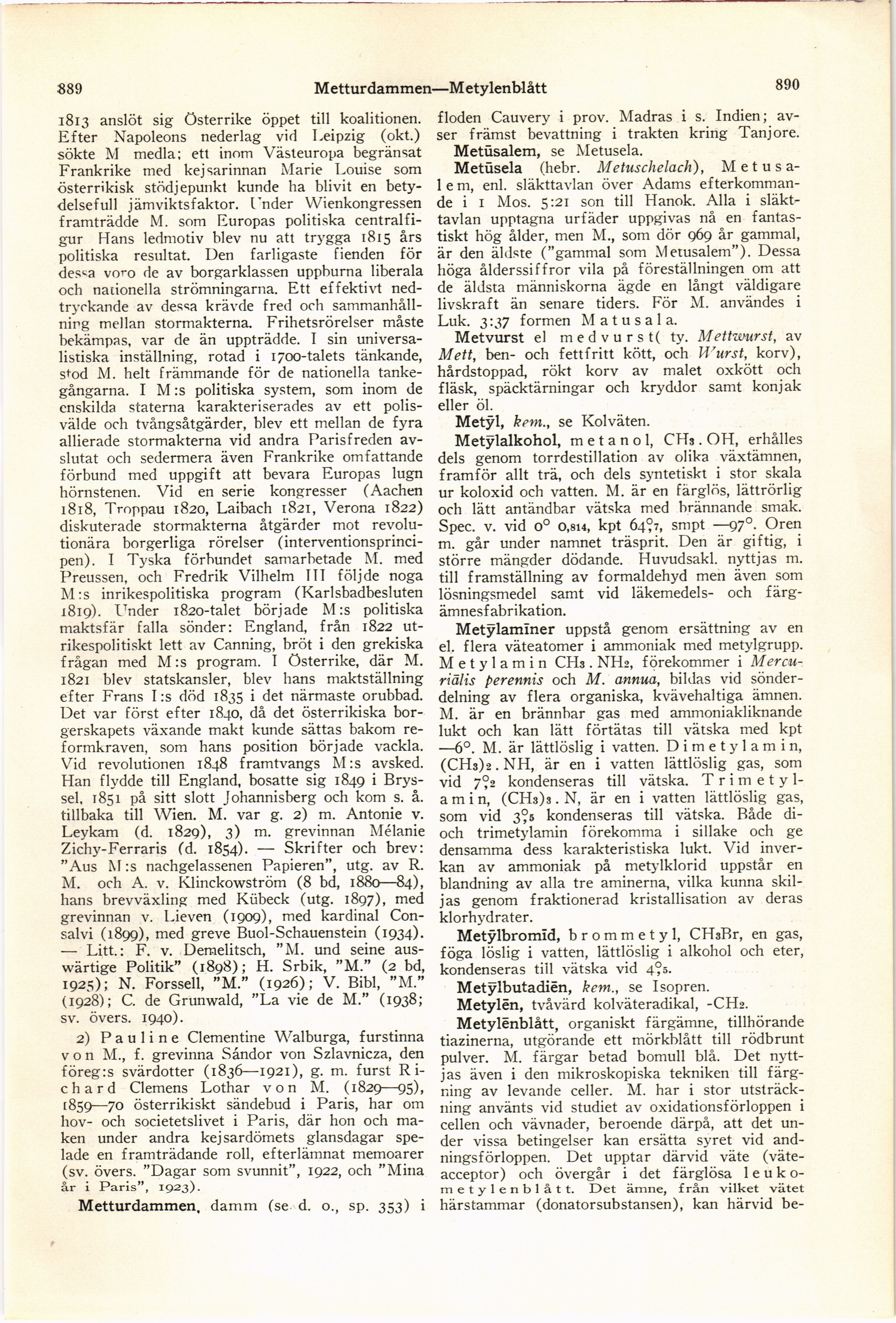 Full resolution (JPEG) - On this page / på denna sida - Metternich, 1. Klemens - Metternich, 2. Pauline - Metturdammen - Metusalem - Metusela, Metusalem - Metvurst el. medvurst - Metyl - Metylalkohol, metanol - Metylaminer - Metylbromid, brommetyl - Metylbutadien - Metylen - Metylenblått