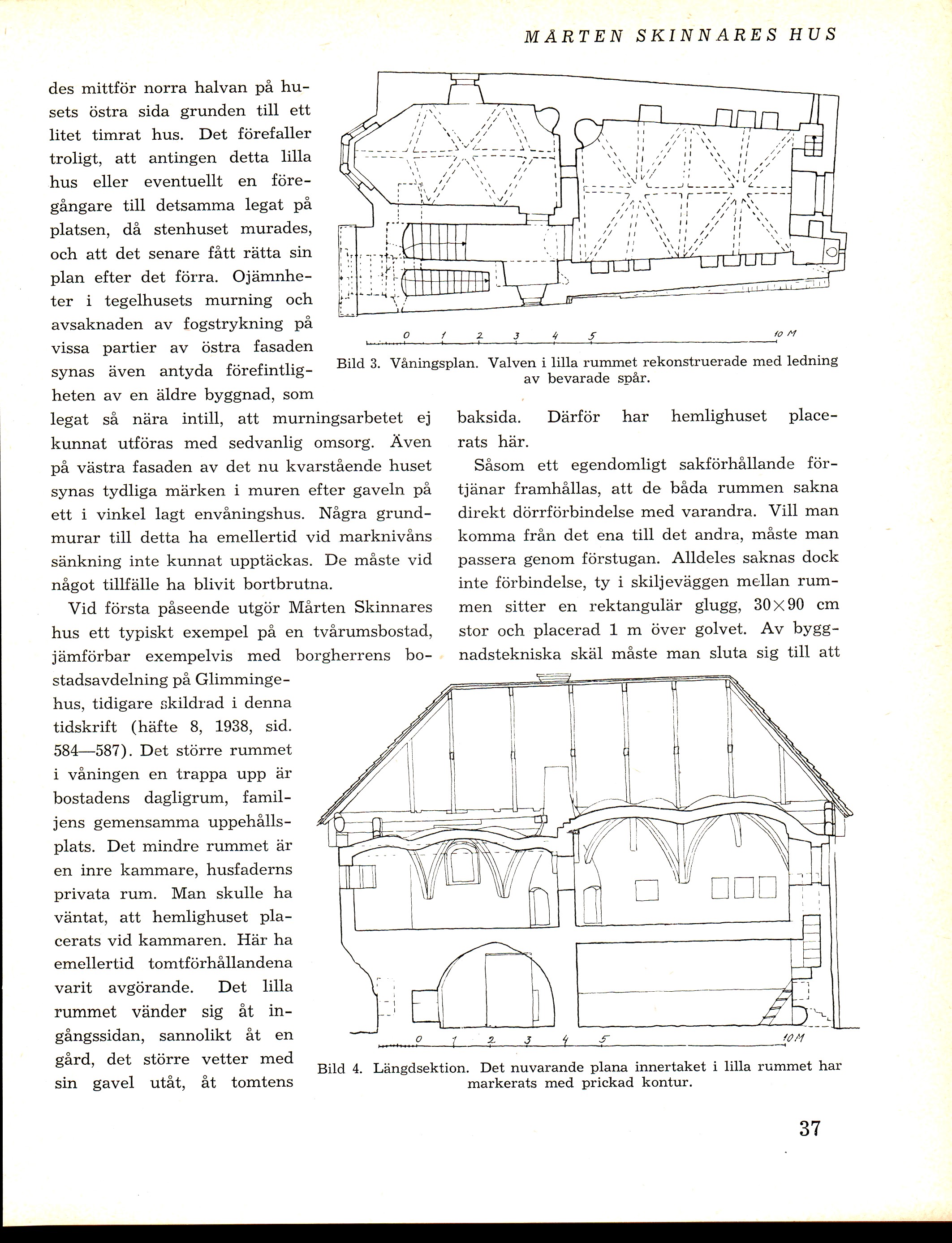 Bild 4. Längdsektion. Det nuvarande plana innertaket i lilla rummet har