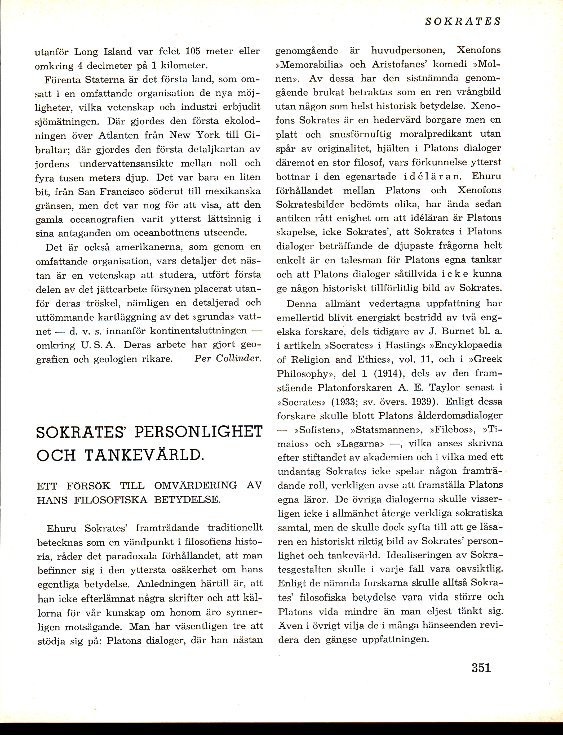 Full resolution (JPEG) - On this page / på denna sida - Häfte 5. Maj 1939 - Moderna sjömätningsmetoder, av Per Collinder - Sokrates personlighet och tankevärld. Ett försök till omvärdering av hans filosofiska betydelse, av G. Oxenstierna