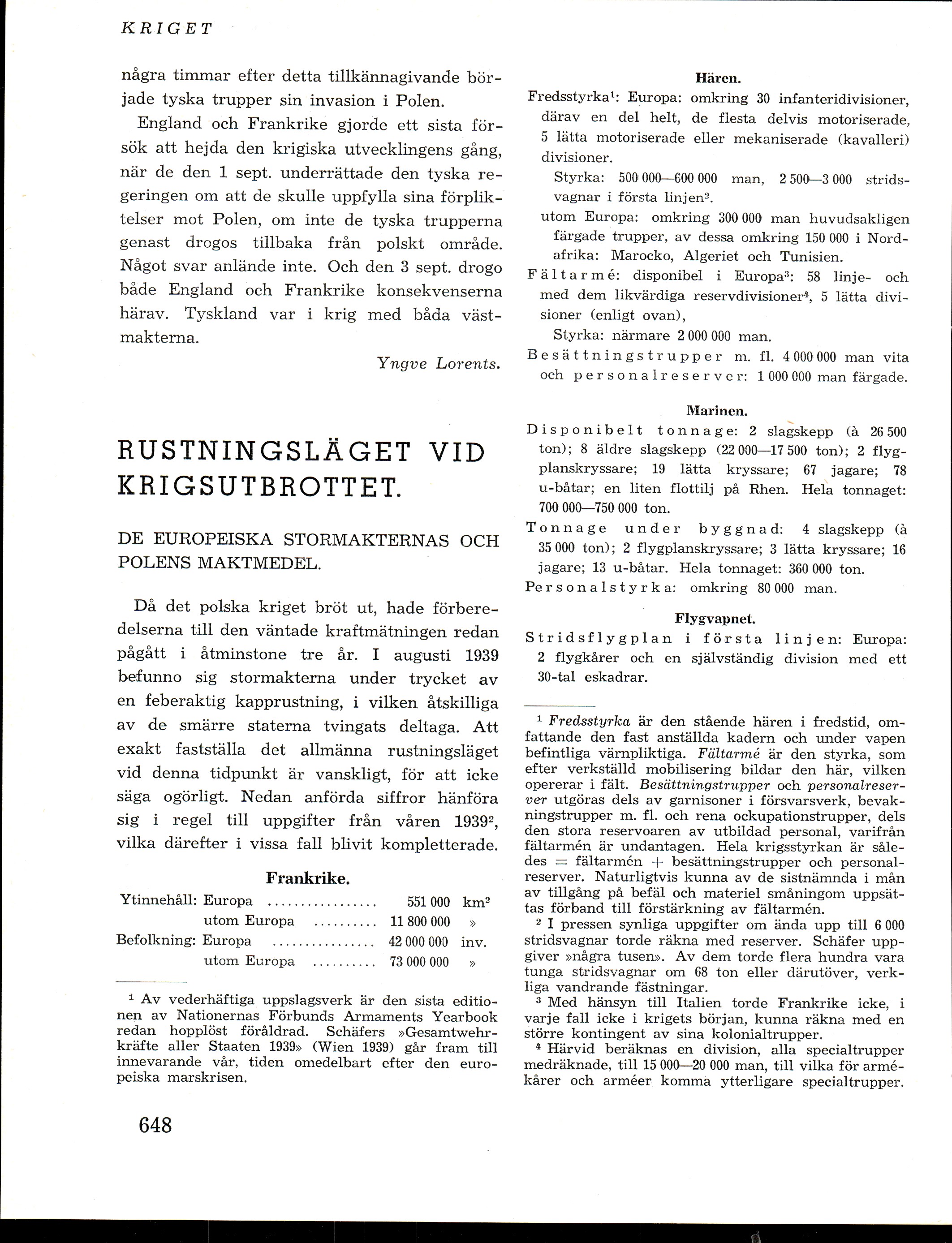 Full resolution (JPEG) - On this page / på denna sida - Häfte 9. Oktober 1939 - Kriget - Krigsutbrottets bakgrund. Några grunddrag i den diplomatiska diskussionen, av Yngve Lorents - Rustningsläget vid krigsutbrottet. De europeiska stormakternas och Polens maktmedel, av Erik Zeeh