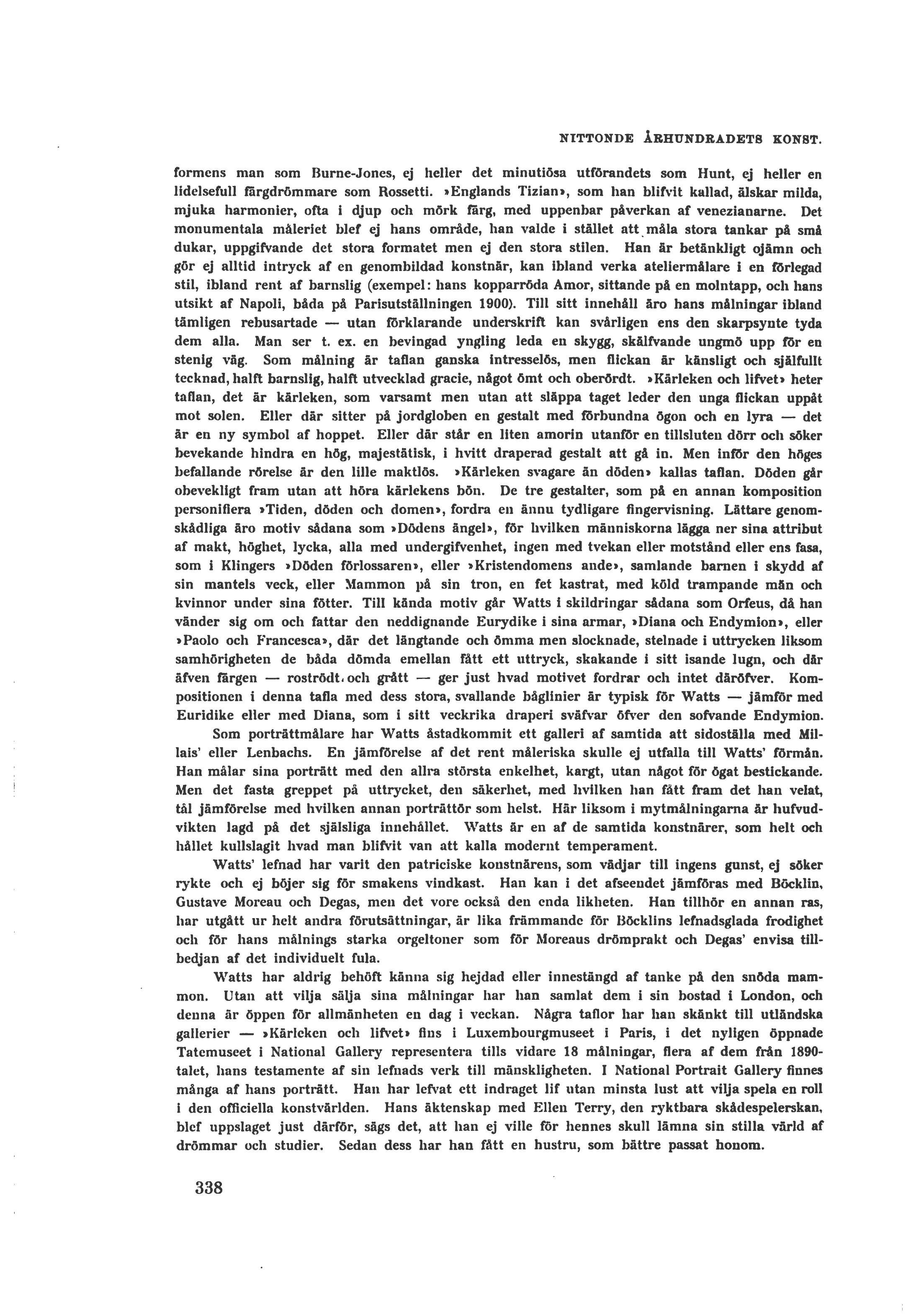 hufvudvikten lagd på det själsliga innehållet. Watts är en af de samtida konstnärer, som helt och