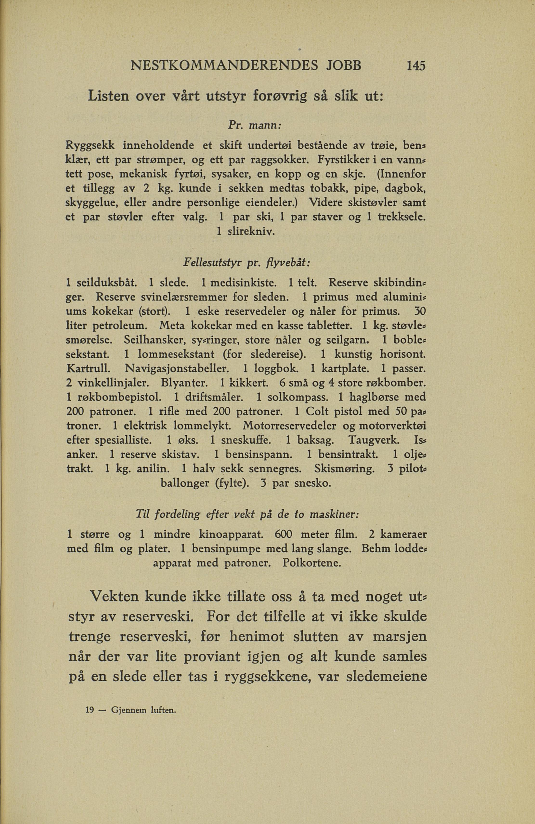 1 seilduksbåt. 1 slede. 1 medisinkiste. 1 telt. Reserve skibindin*
