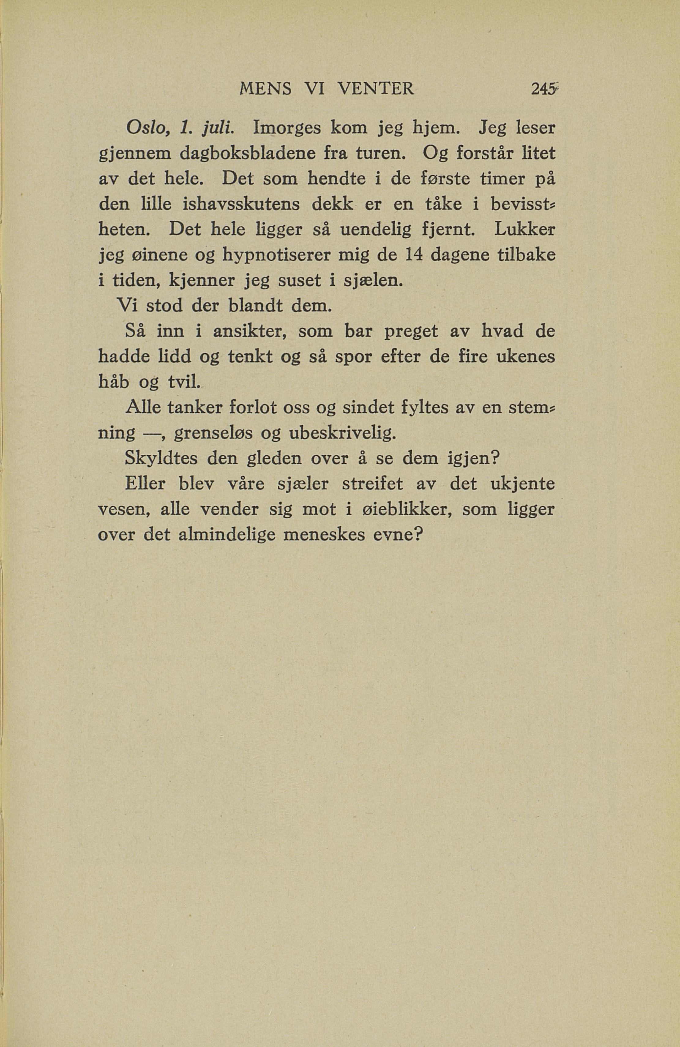 Oslo, 1. juli. Imorges kom jeg hjem. Jeg leser