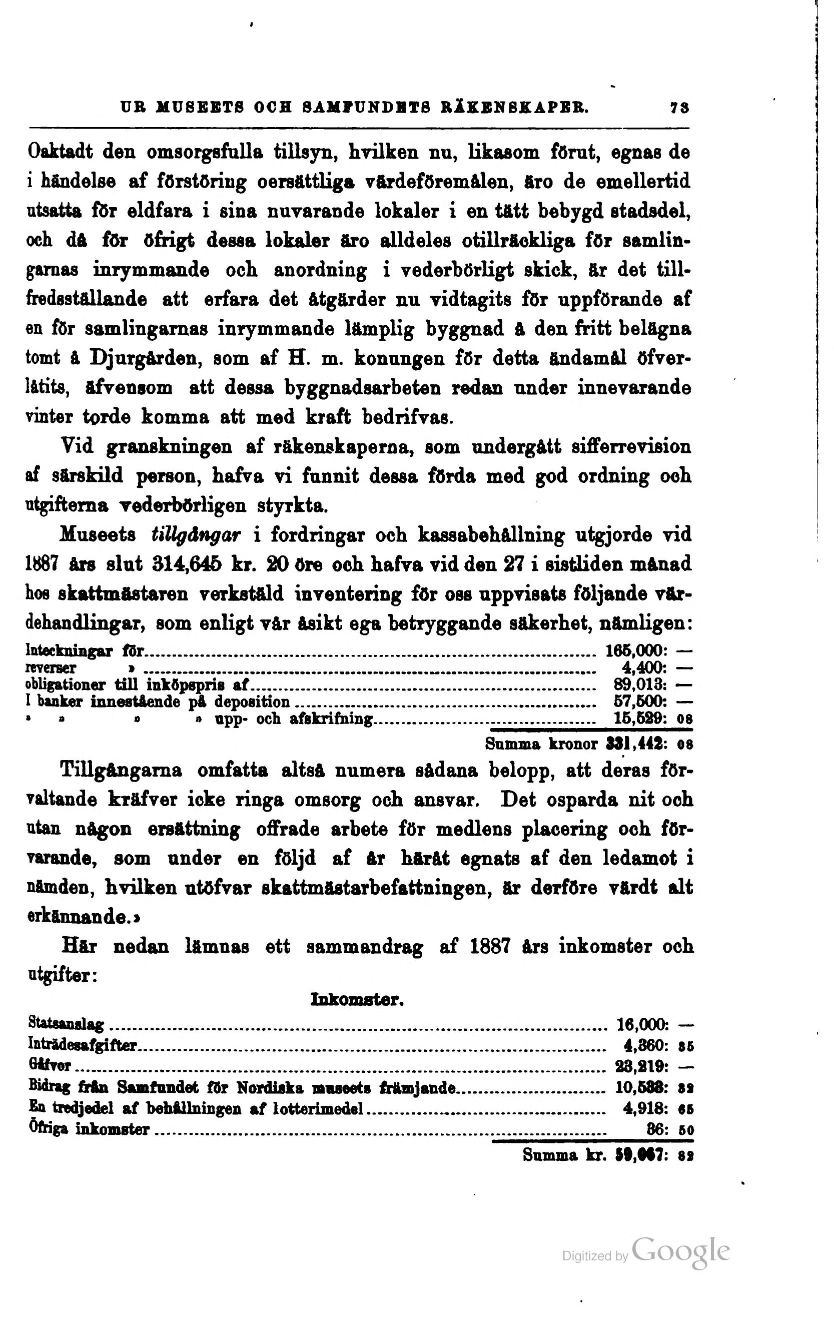 Här nedan lämnas ett sammandrag af 1887 års inkomster och