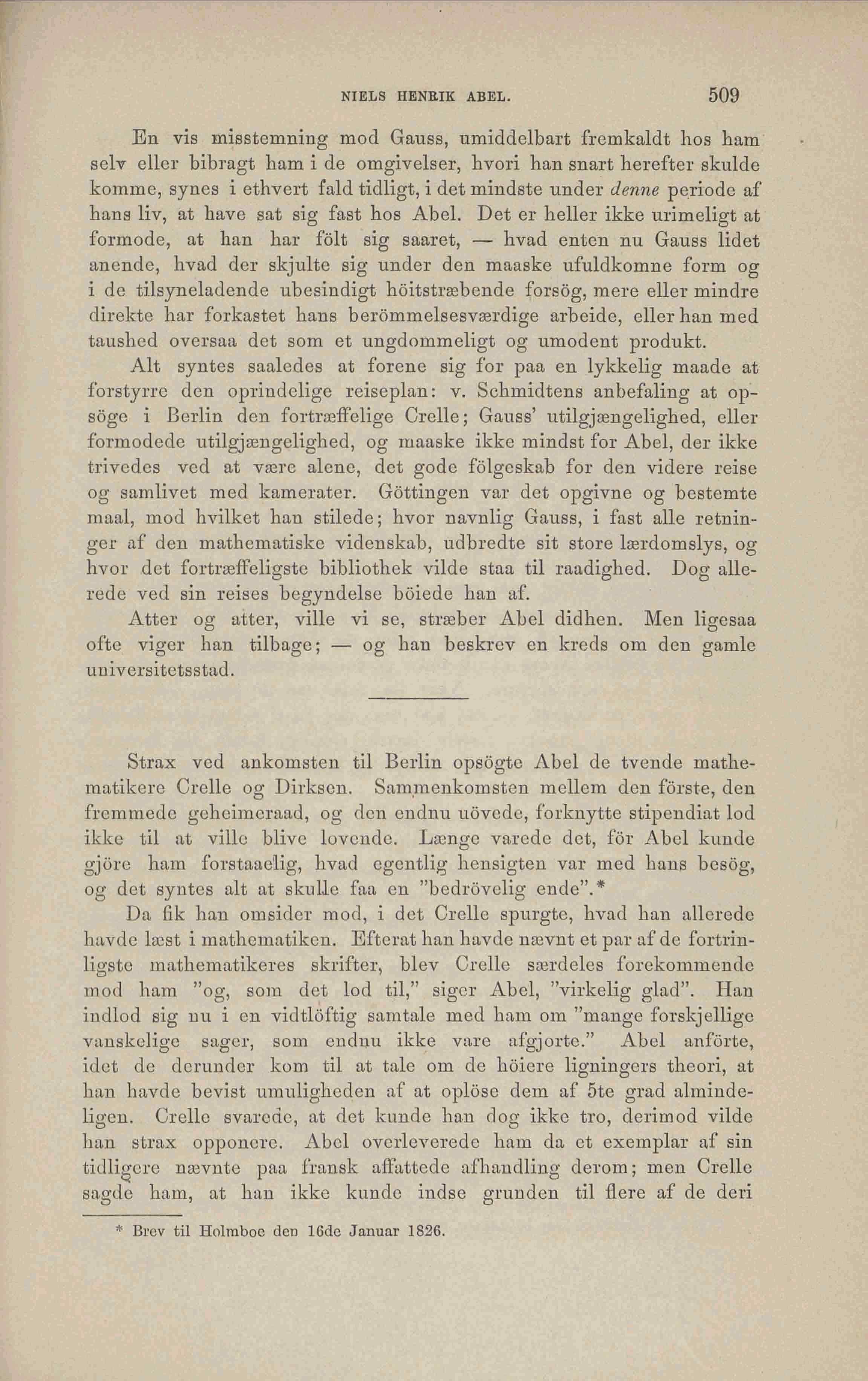 Full resolution (JPEG) - On this page / på denna sida - N:r 6 - Bjerknes, C. A.: Niels Henrik Abel - II. Nedreisen til Berlin, sammentræffet med Crelle og grundlæggelsen af en mathematisk journal