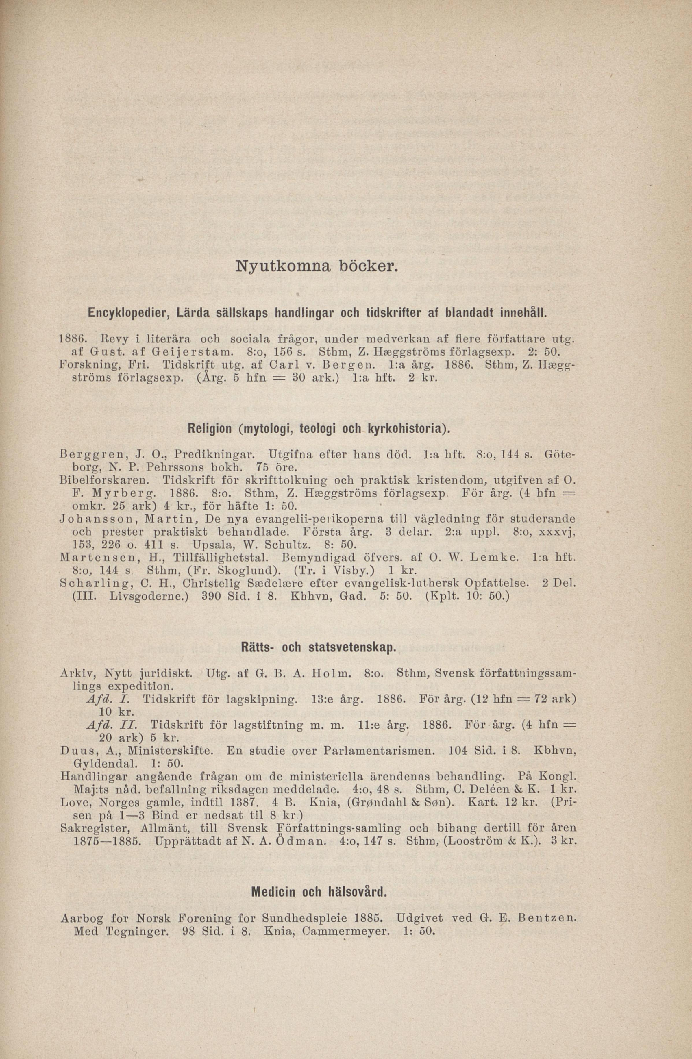 Forskning, Fri. Tidskrift utg. af Carl v. Bergen. l:a årg. 1886. Sthm, Z. Hægg