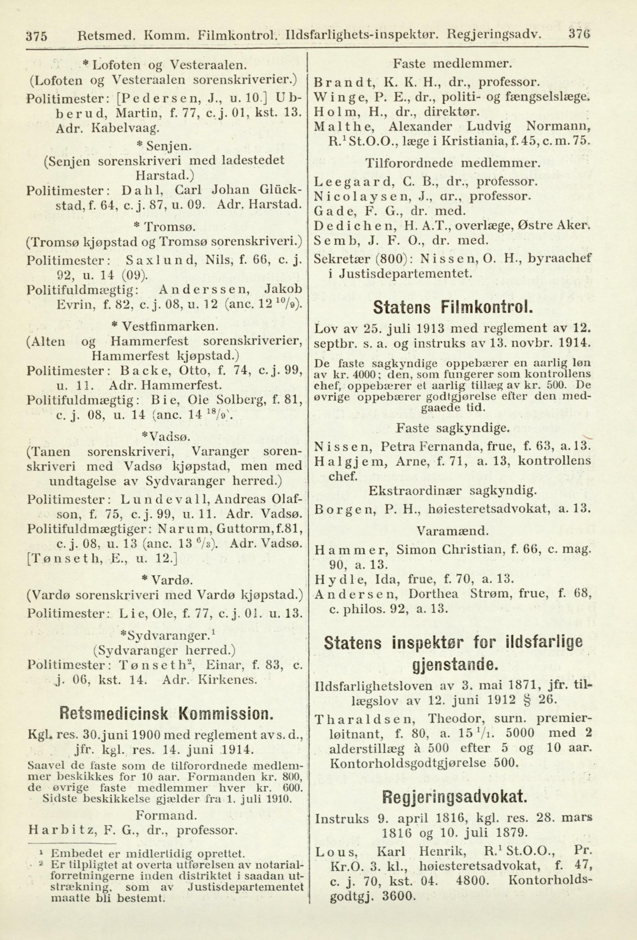 375 Retsmed. Komm. Filmkontrol. Ildsfarlighets-inspektør. Regjeringsadv. 376