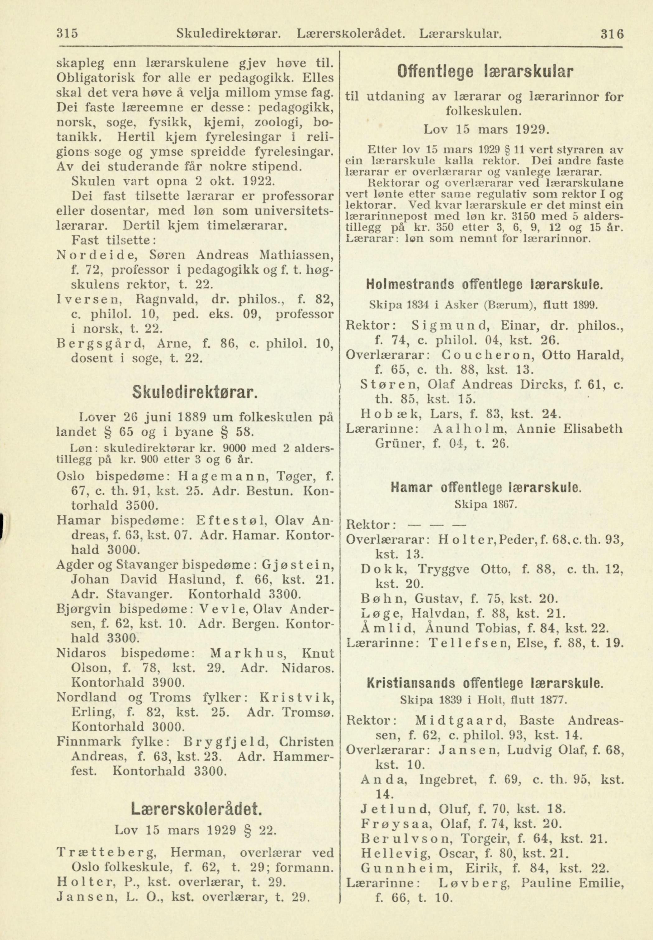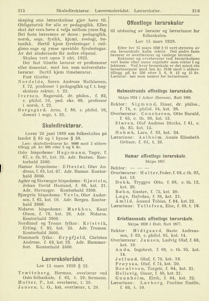 315 Skuledirektørar. Lærerskolerådet. Lærarskular. 316