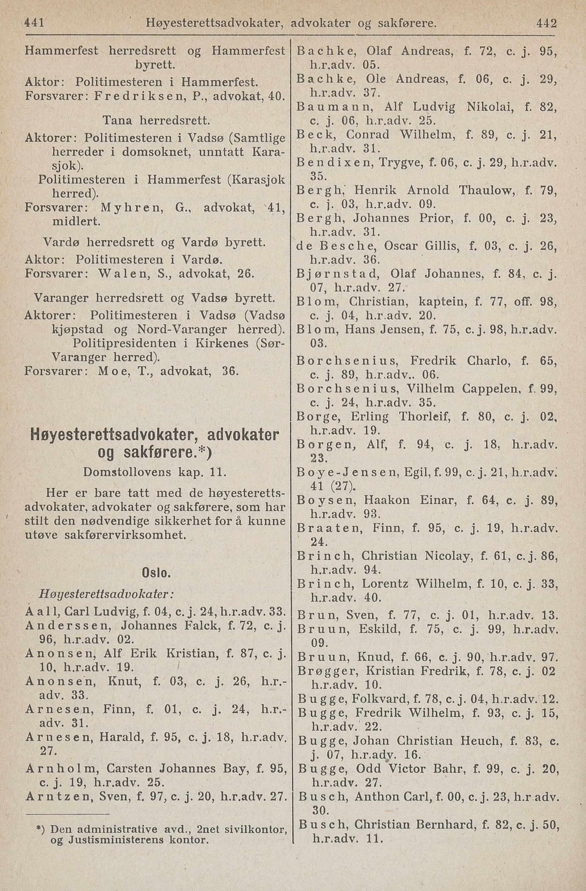 441 Høyesterettsadvokater, advokater og sakførere. 442