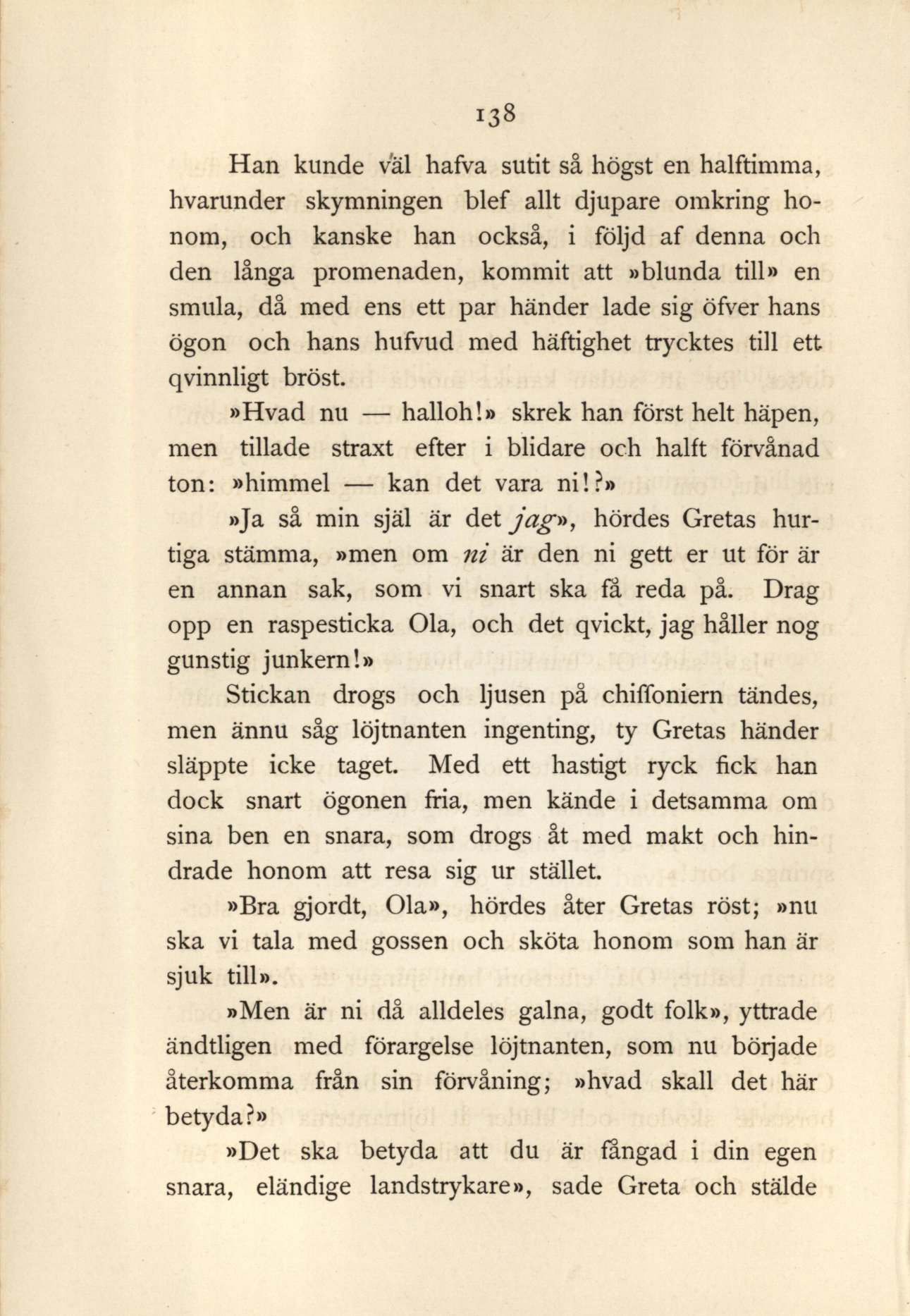men ännu såg löjtnanten ingenting, ty Gretas händer