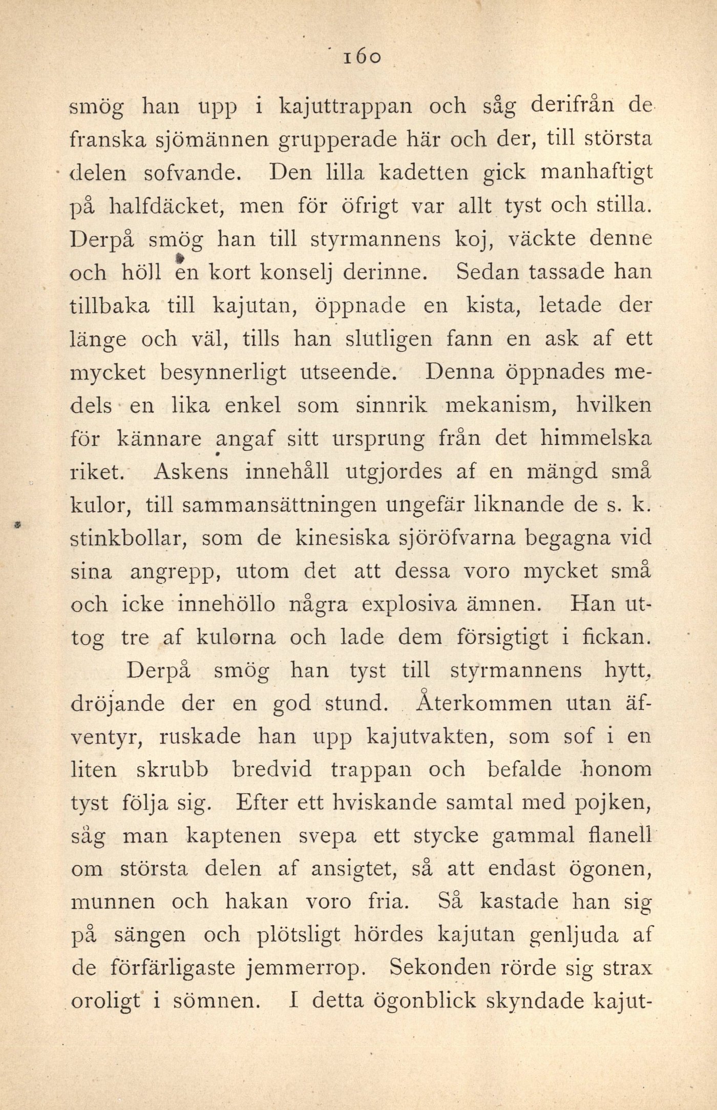 smög han upp i kajuttrappan och såg derifrån de